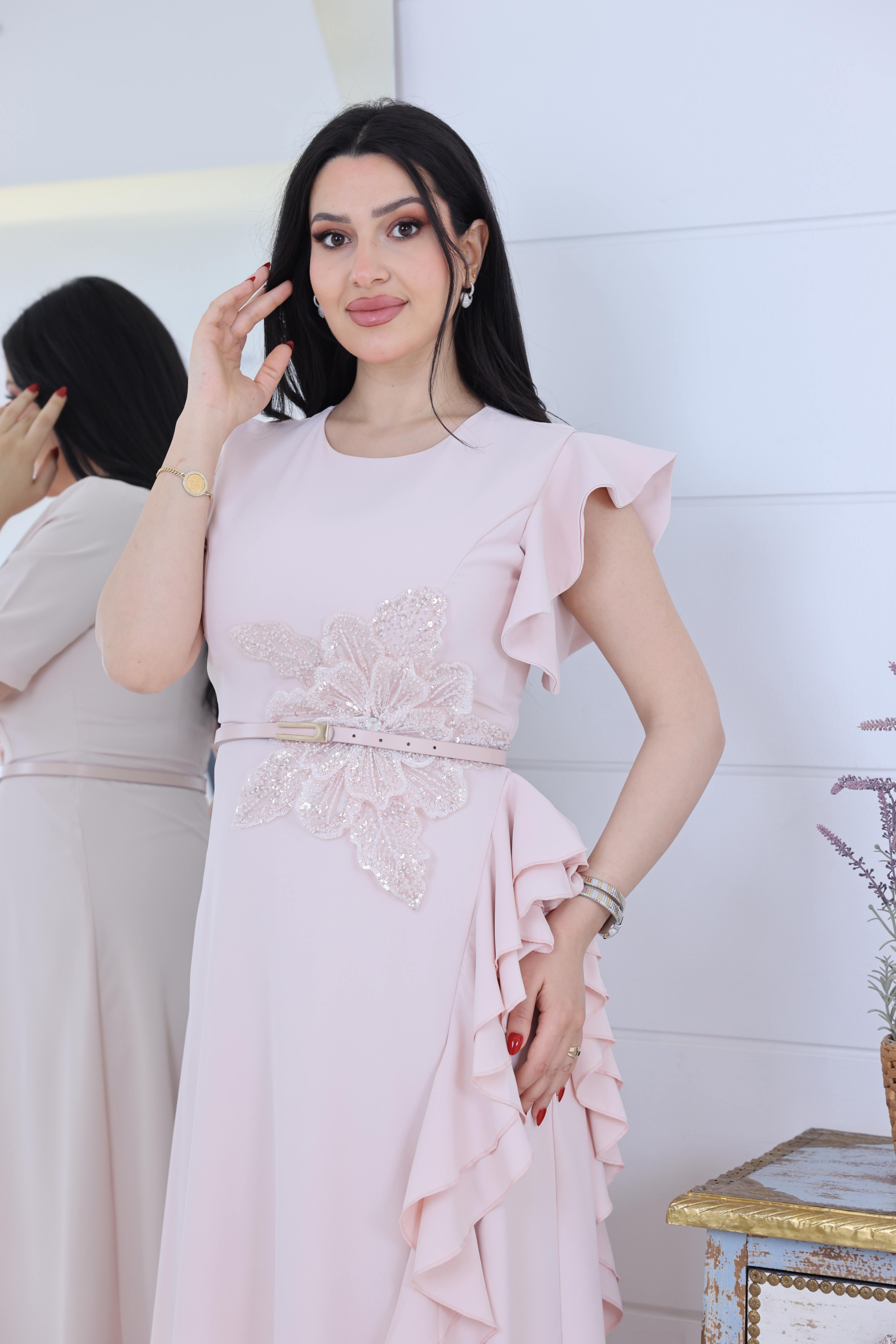 فستان جورسيه سادة نصف كم مزين بكشكش على الجنب ووردة ترتر على الخصر مع حزام - خربزي