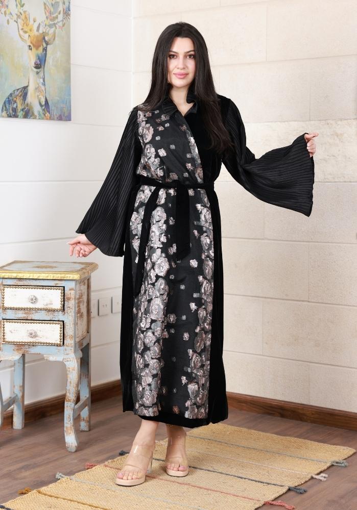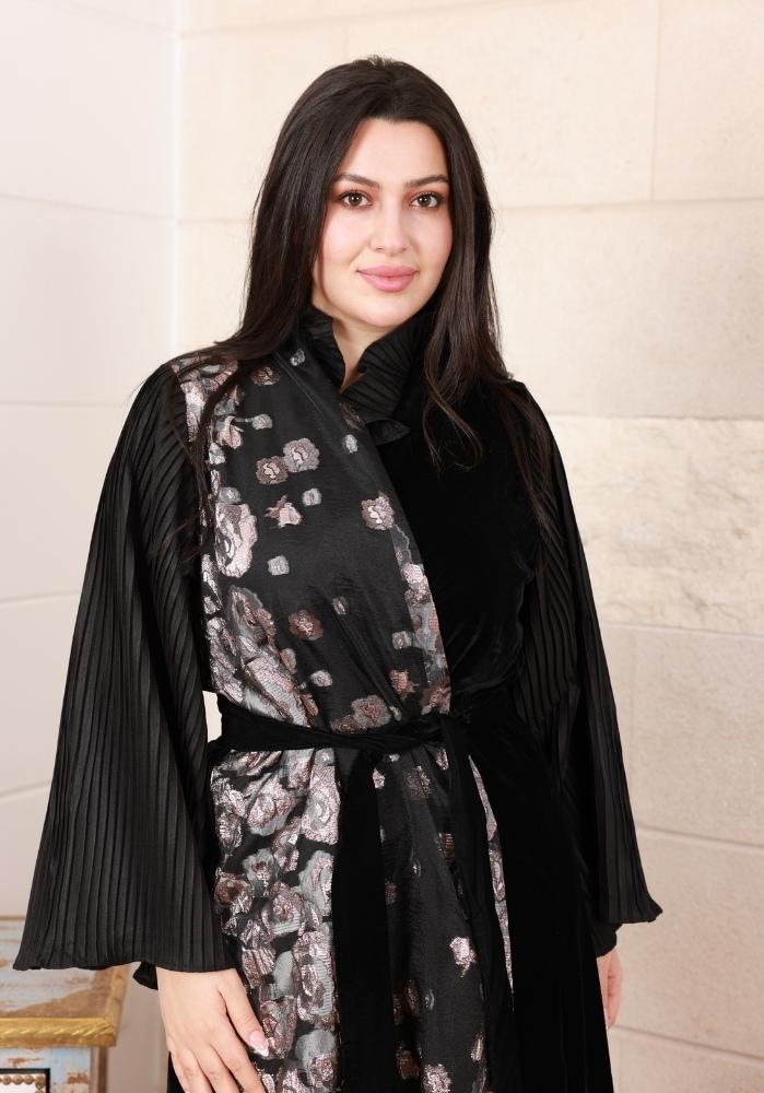 بشت شتوي حريمي مصمم بعناية فائقة من خامة الفيلفيت عالية الجودة. يتميز بتصميم الجكار المورد اللي يضيف لمسة فخامة للقطعة.