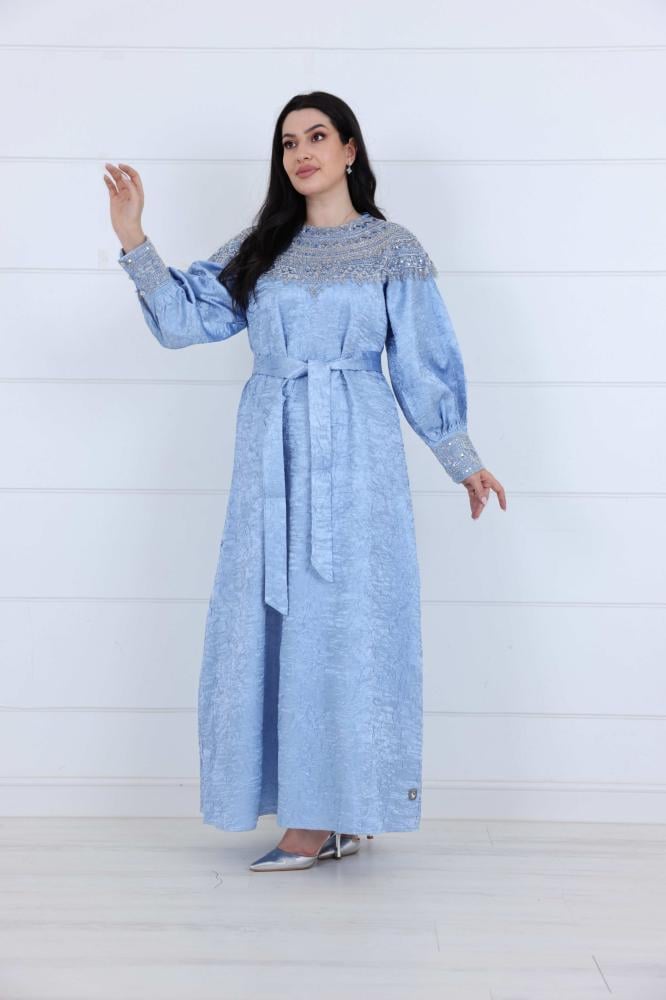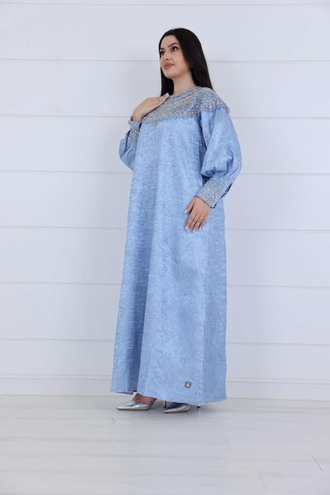 جلابية تفتة مكسرة مزينة بشك على الصدر والاكمام لون سماوي