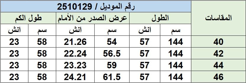 جدول المقاسات:-