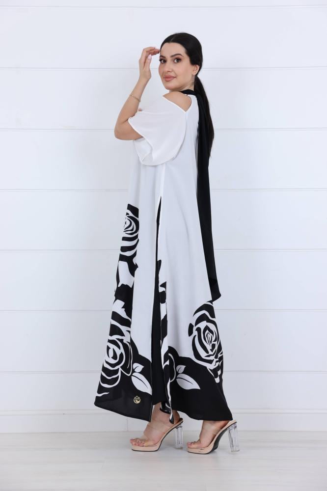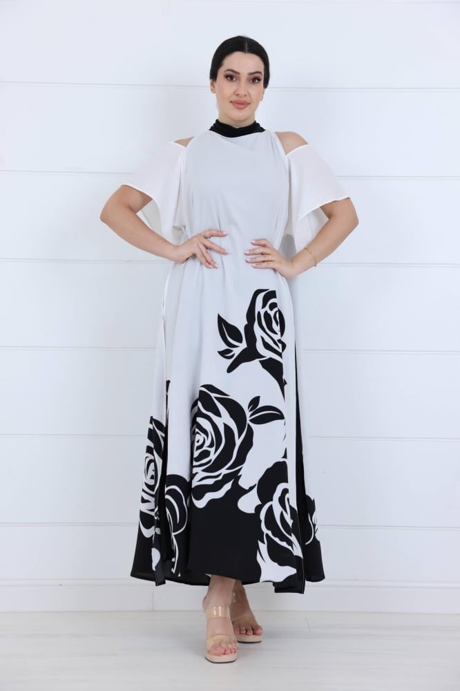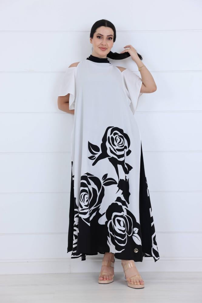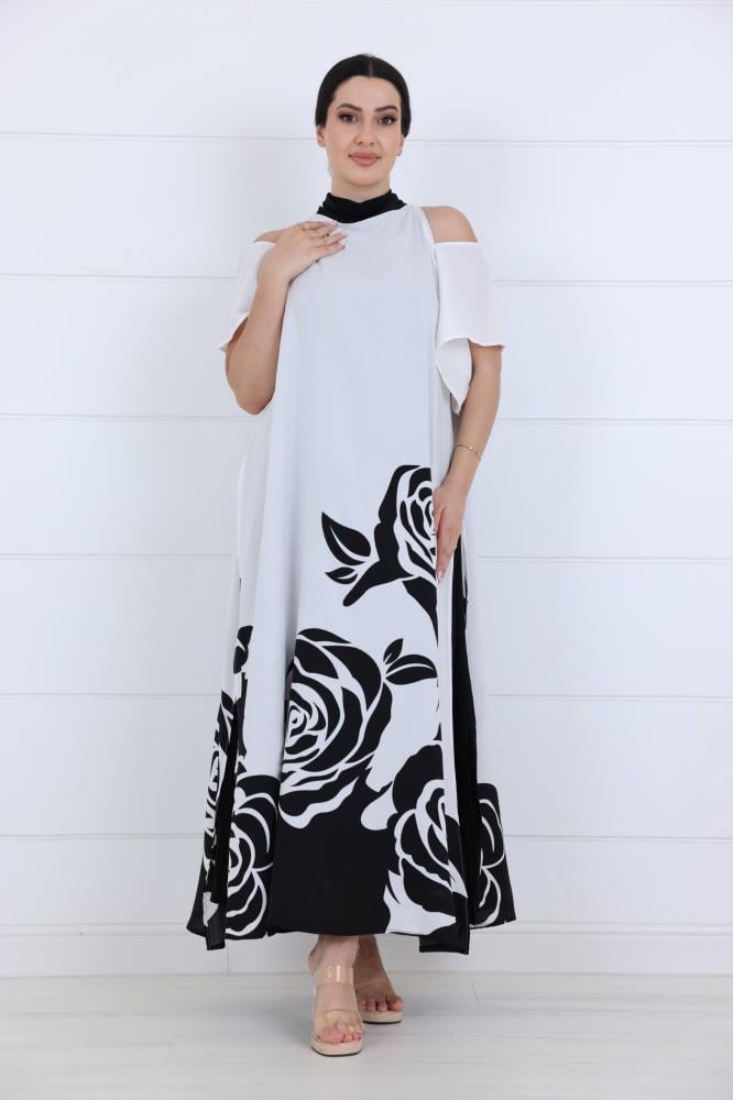 جلابية روزلين بنقشة الورد نص كم هاف مفتوح لون سكري