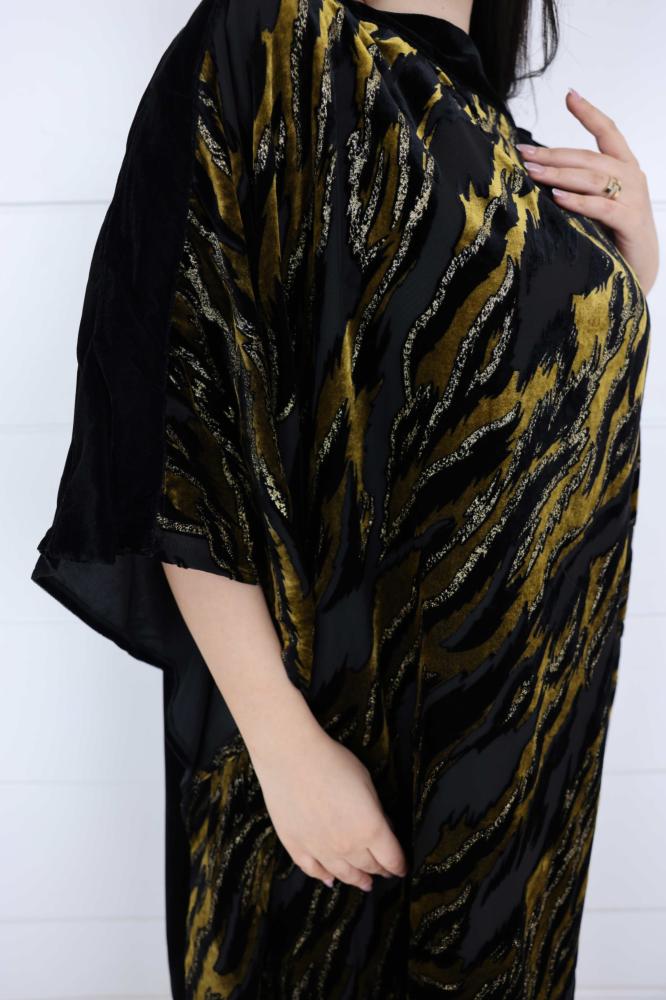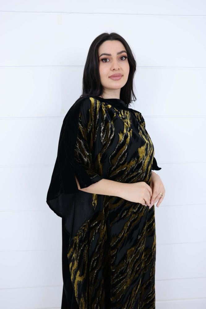 تميّزي هذا الشتاء بإطلالة جريئة وفاخرة مع جلابية مخمل بتصميم نمري لون أسود ذهبي من آيس كيوب ستور
