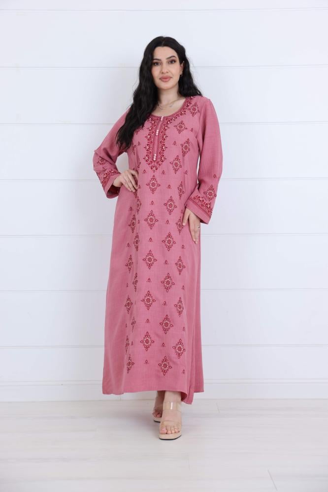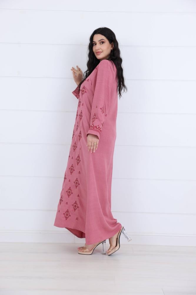 جلابية صيفي قطن جورسيه بتطريز عصري وبشك وخرز لامع لون وردي