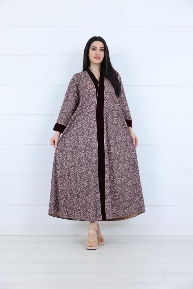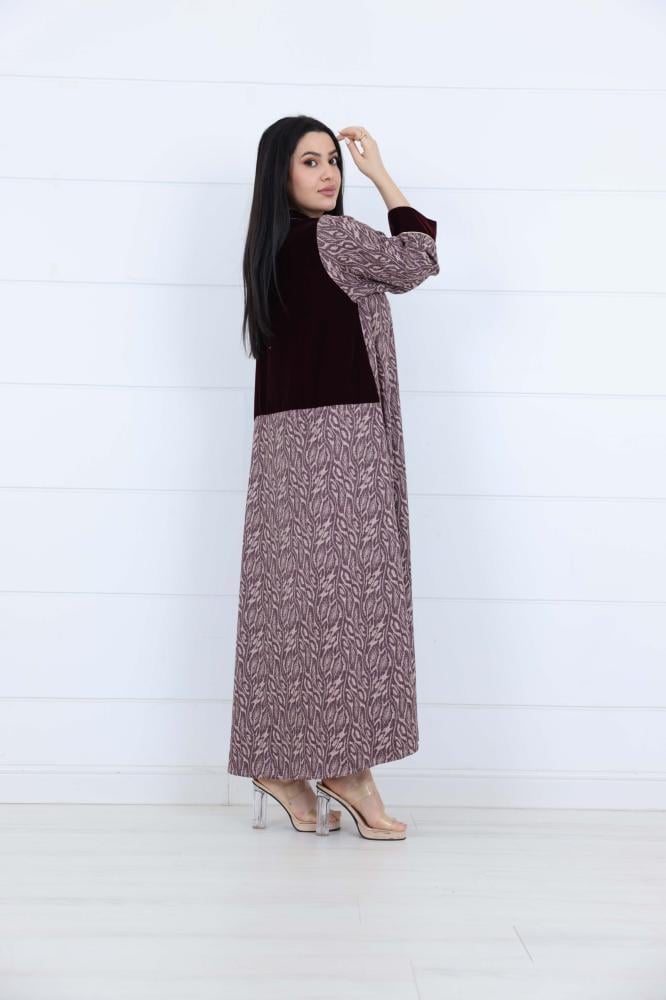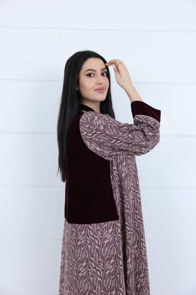 جلابية عنابي سترتش مخمل بشريط مخمل وياقة V