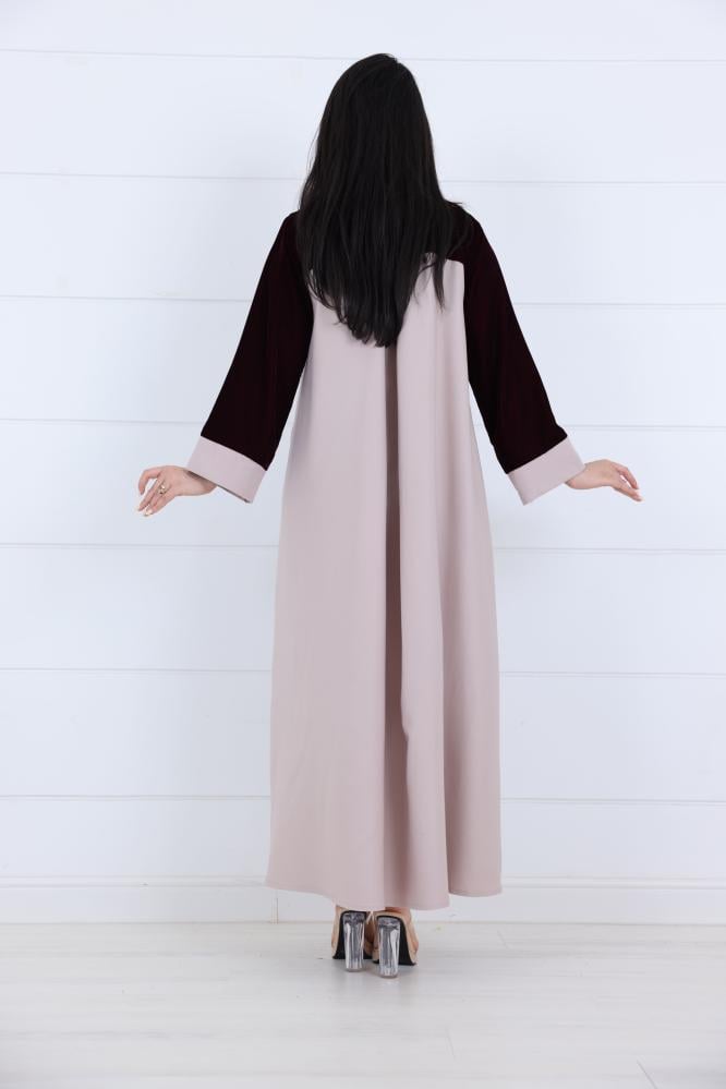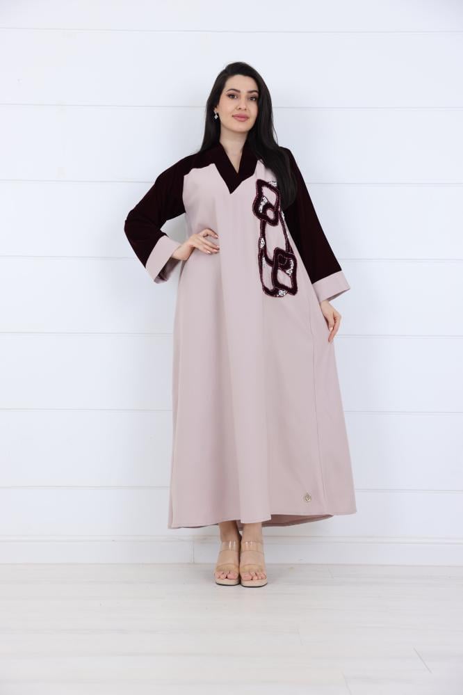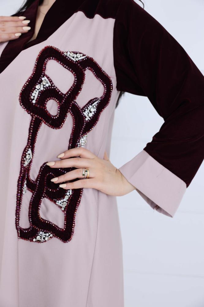 جلابية كريب مع مخمل حلق V برسمة مخمل على الصدر لون عنابي خربزي