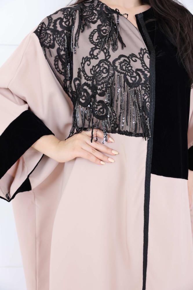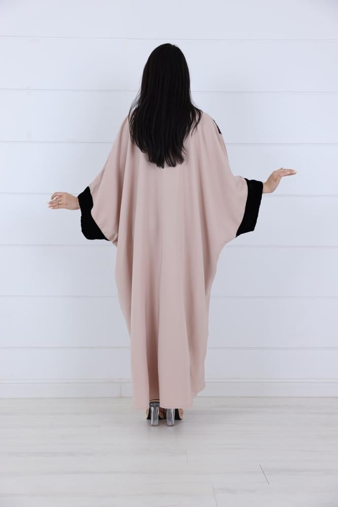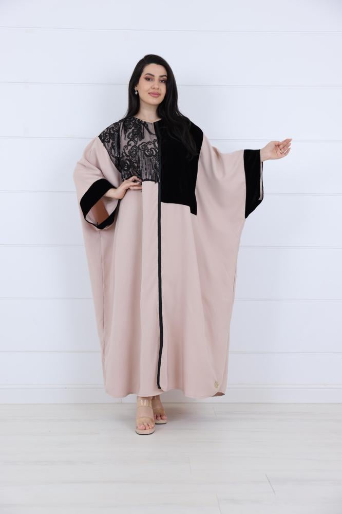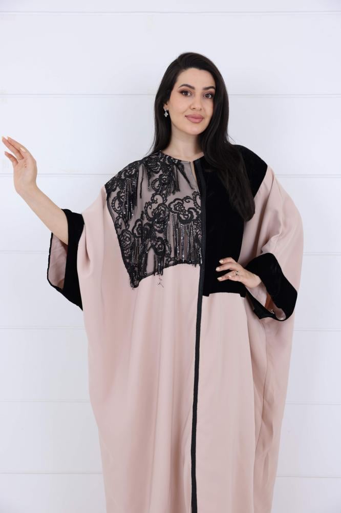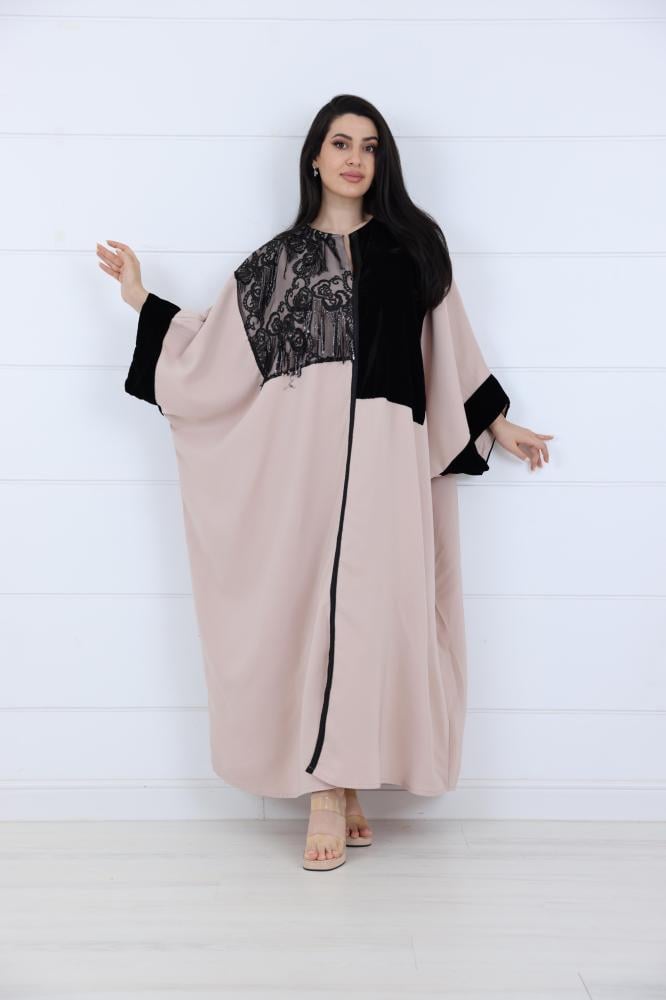 جلابية كريب واسعة مع دانتيل ومخمل لون بيج