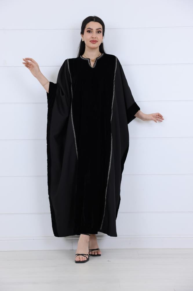 جلابية كريب واسعة يتوسطها مخمل اسود وبشريط فضي