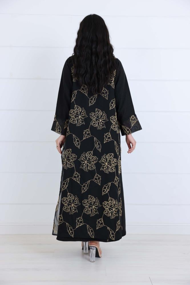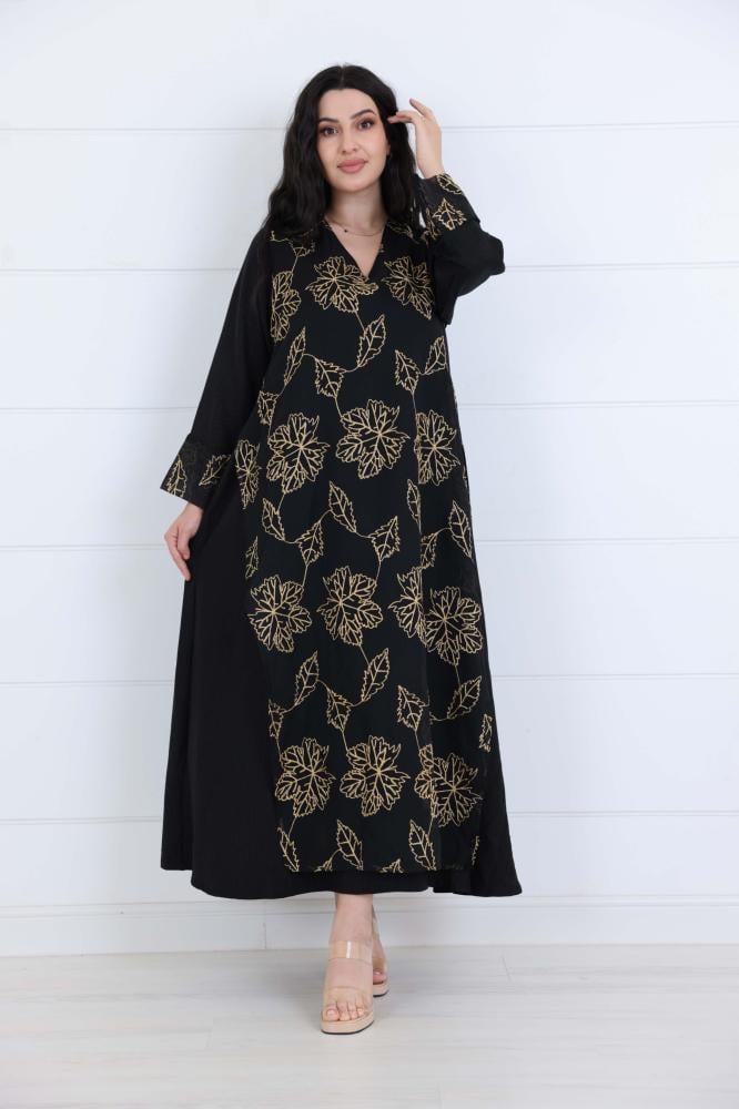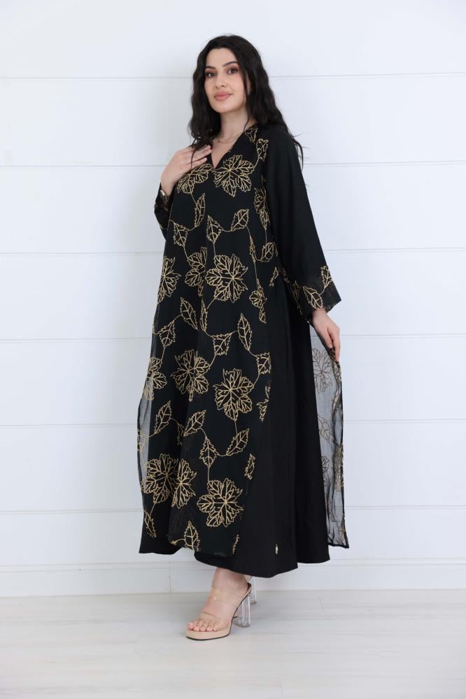 جلابية لنن مشجرة بخيوط بلون اسود على قصة واسعة على الجانبين