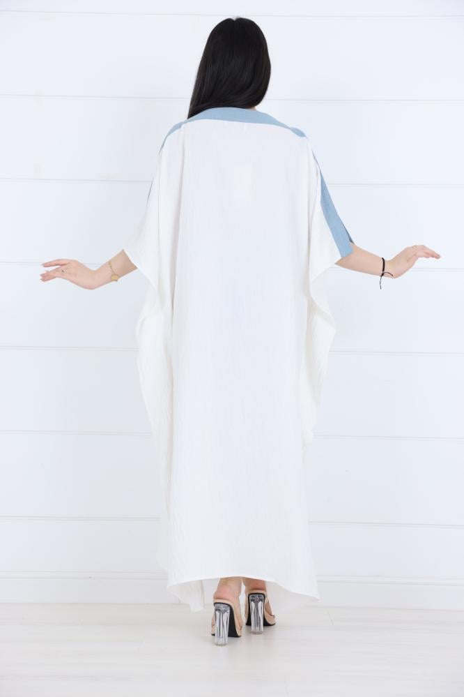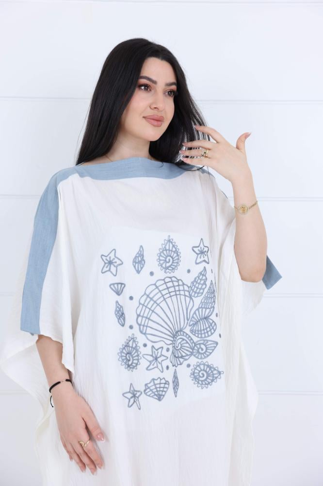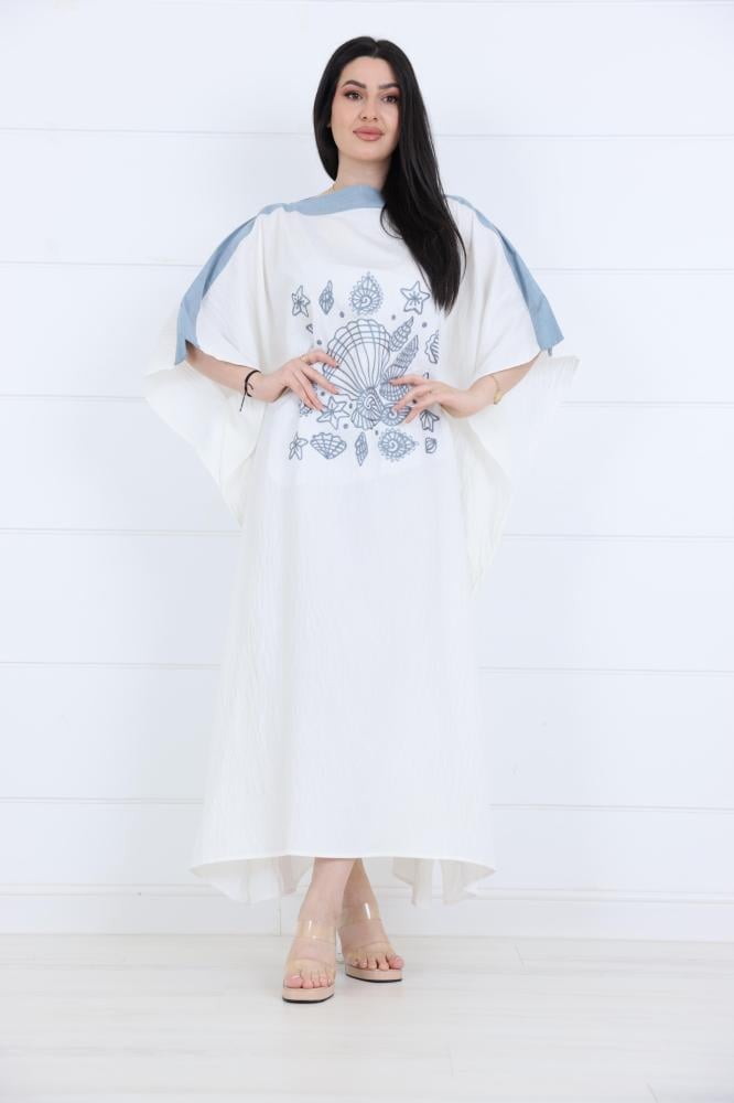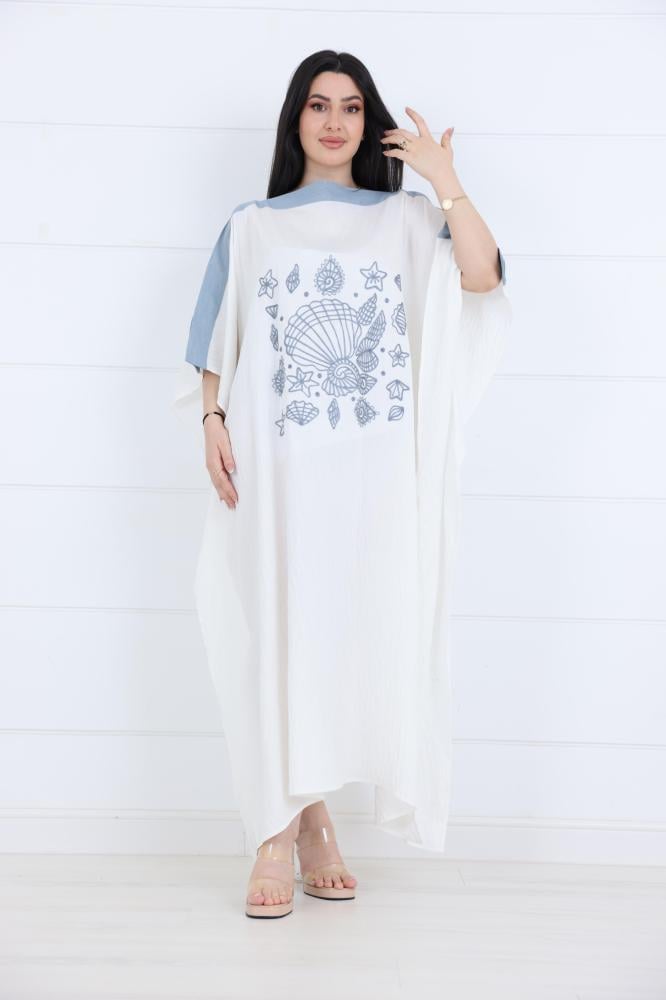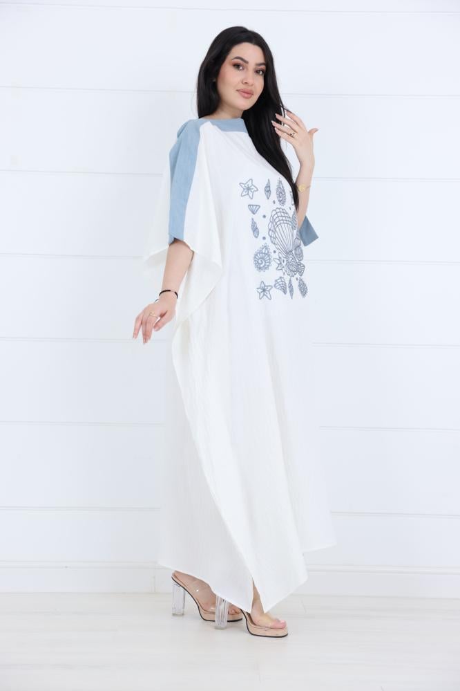 جلابية لينن ناعمة بلون سكري بتطريز صدفي أزرق – أناقة صيفية بنعومة البحر