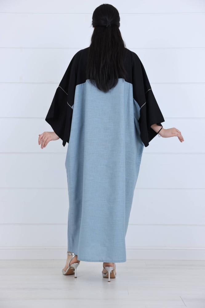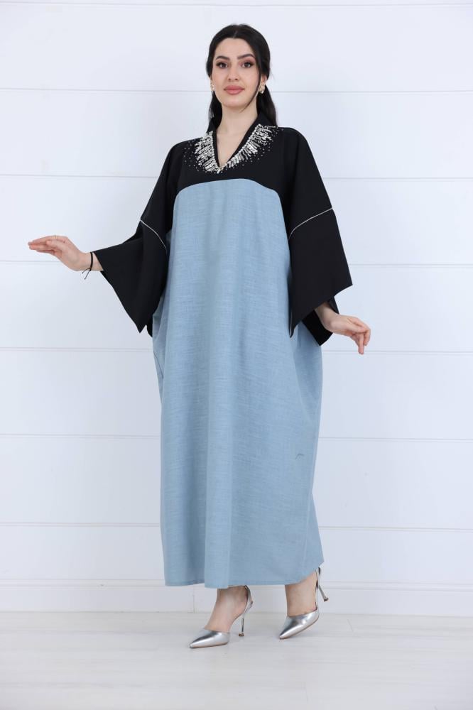 جلابية لينن واسعة ومطرزة على الياقة لون سماوي