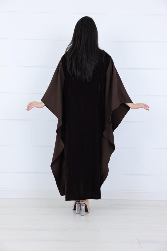 جلابية مخمل واسعة حلق V بخرز لول فضي لون بني