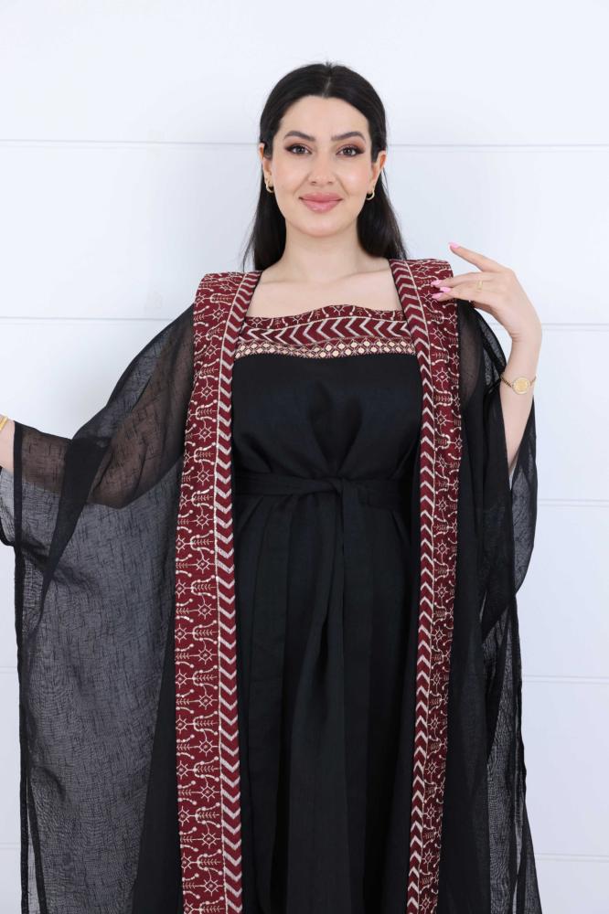 جلابية اسود لينن قطعتين مزينة بشرائط مطرزة