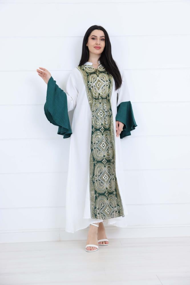 جلابية لينن بتطريز تراثي انيق ناعم وبكم كلوش واسع
