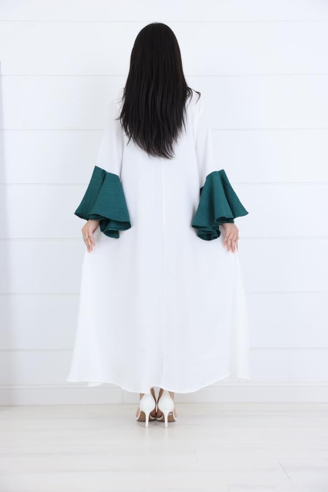تميزي بإطلالة أنيقة وعملية مع جلابية نسائية صيفية من قماش لينن باللون الأبيض مع تطريز أخضر فاخر. تتميز بتصميم واسع محتشم يتيح الراحة في الحركة، مع أكمام كلويش عصرية تضيف لمسة أنثوية جذابة. خامة لينن ناعمة وخفيفة تناسب أجواء الصيف في السعودية وتضمن لك الراحة طوال اليوم.