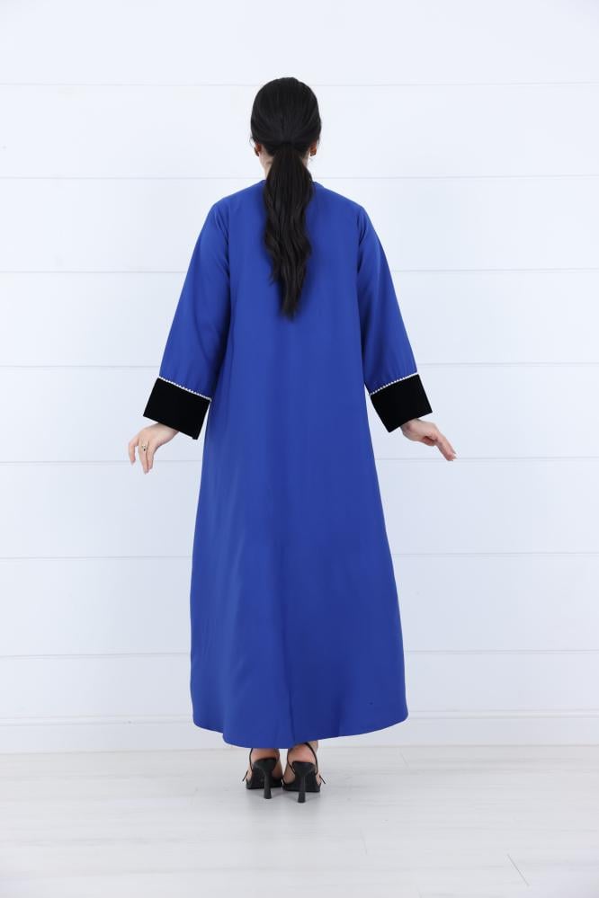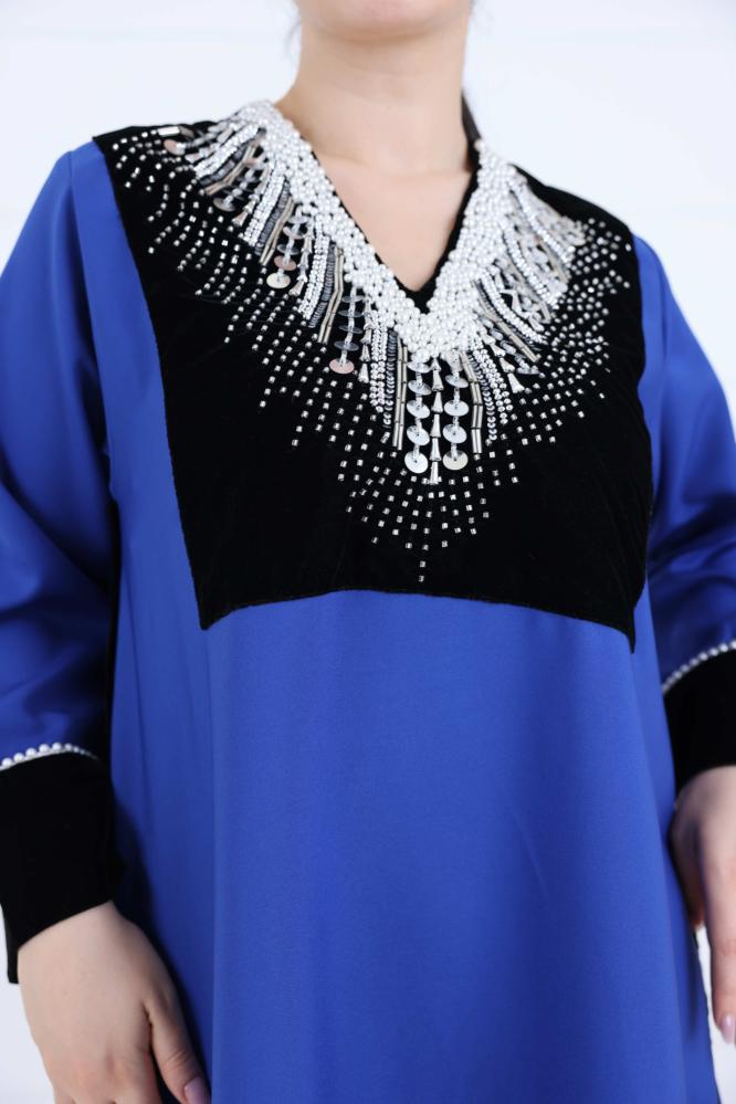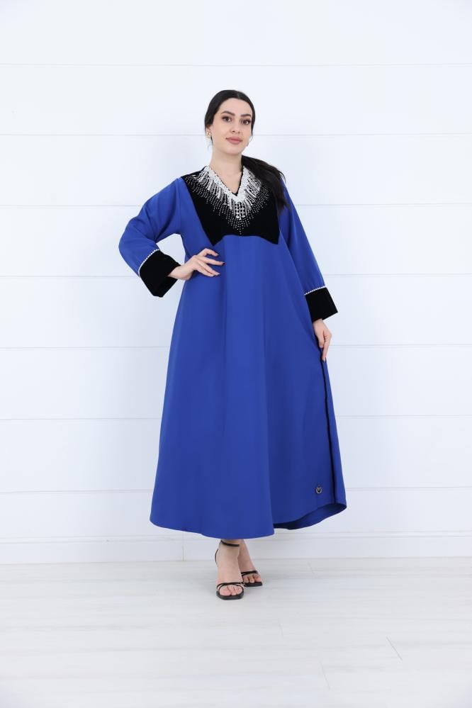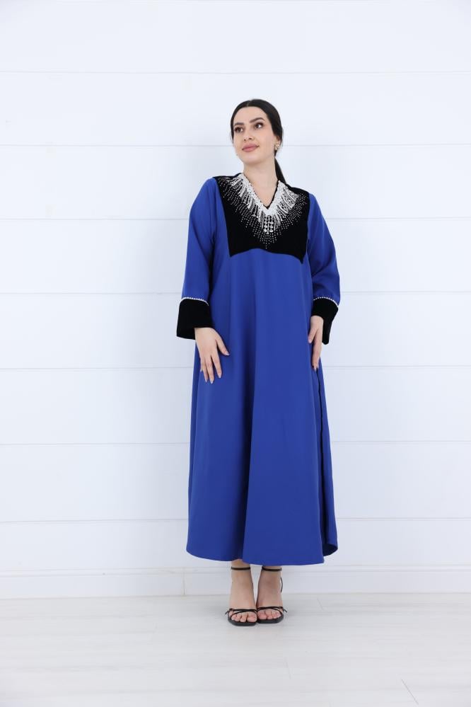 جلابية نسائي مخمل بياقة V مطرزة لون ازرق