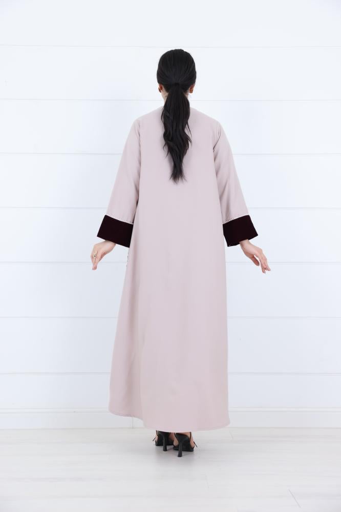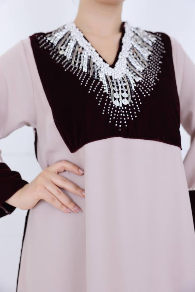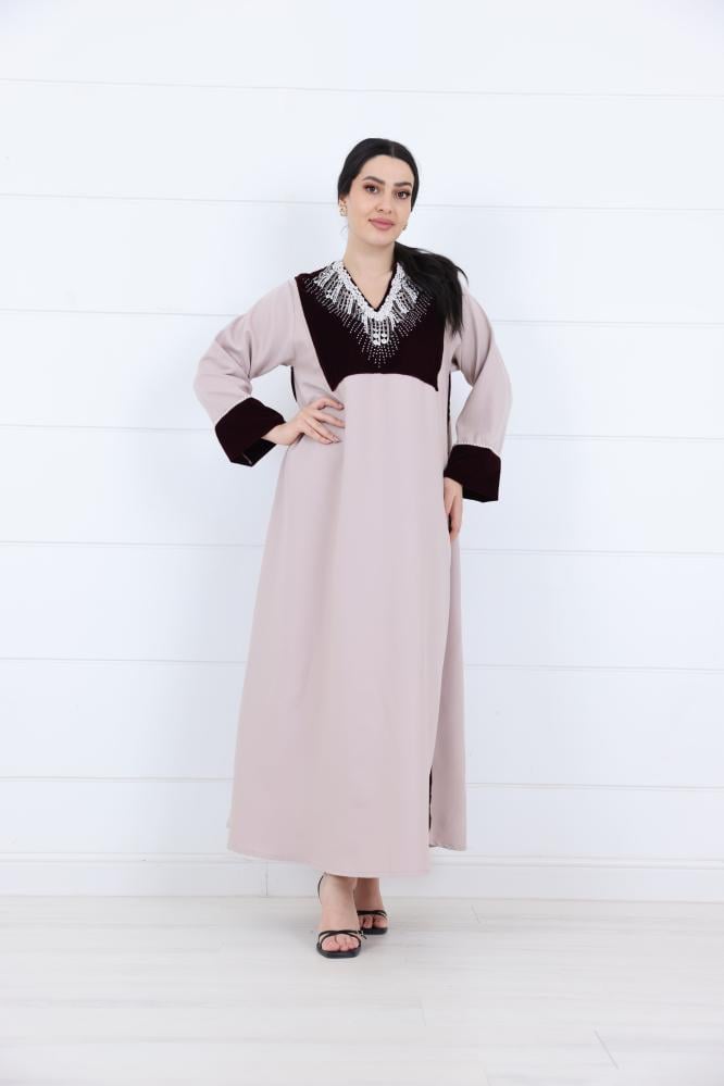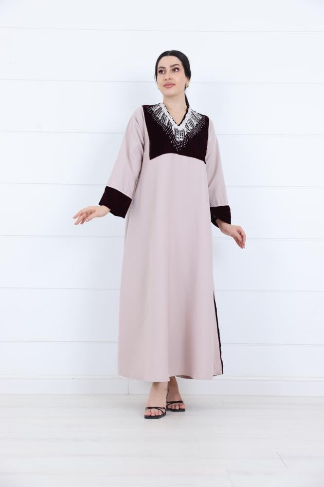جلابية نسائي مخمل بياقة V مطرزة لون بيج