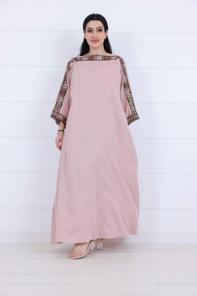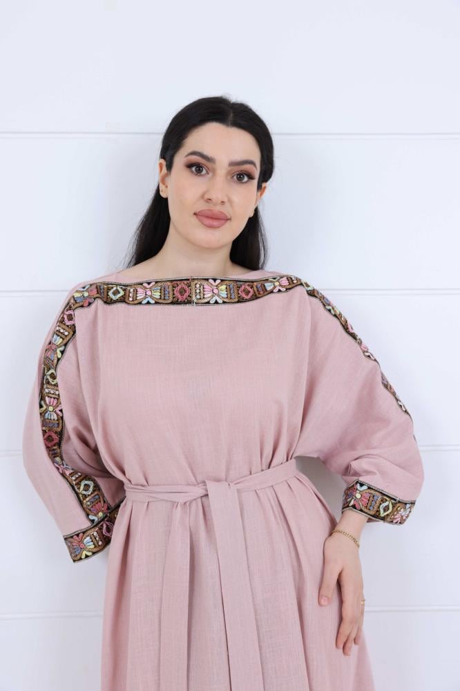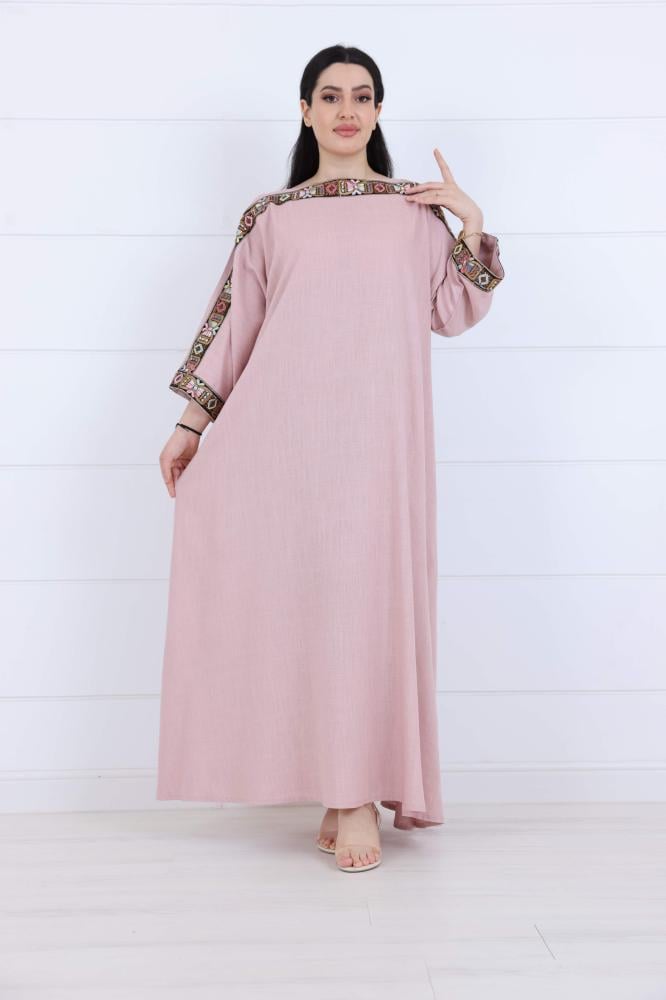جلابية نسائي واسع بخامة لنن برقبة عين مزينة بالحواف بشريط مطرز لون خربزي