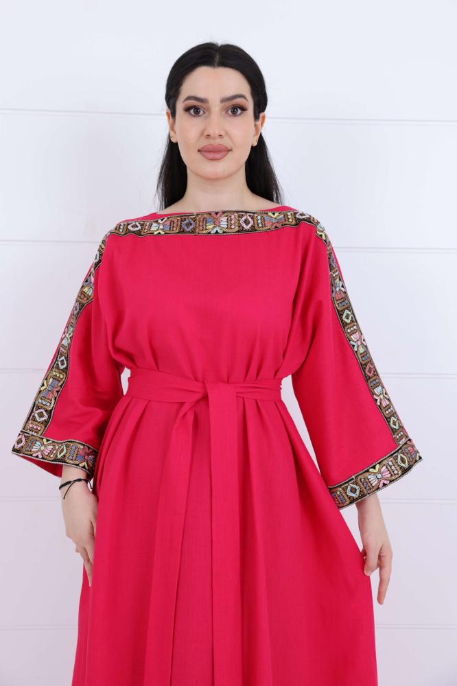 جلابية نسائي واسع بخامة لنن برقبة عين مزينة بالحواف بشريط مطرز لون فوشي