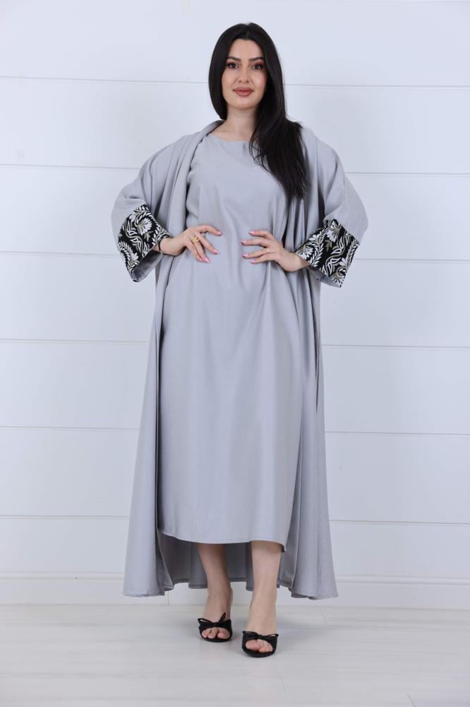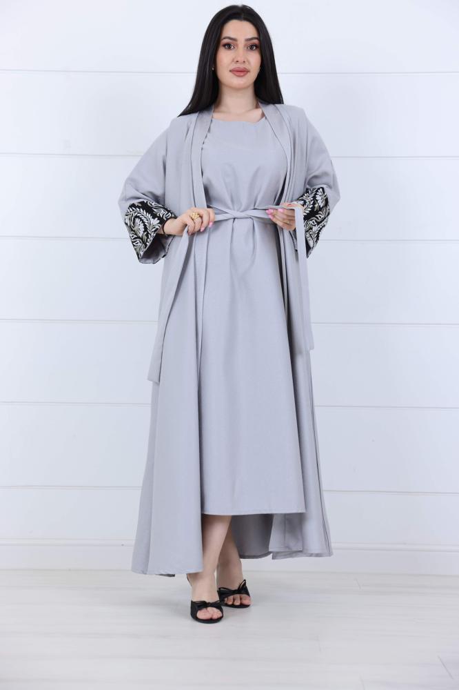 عباية صيفي قطعتين بأكمام مطرز مورد لون رمادي