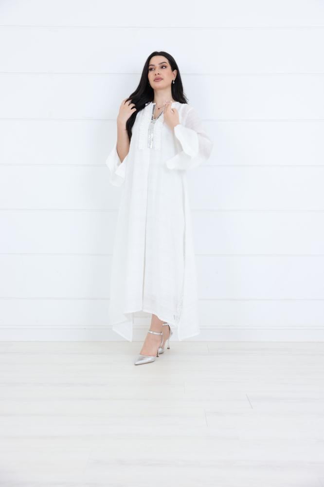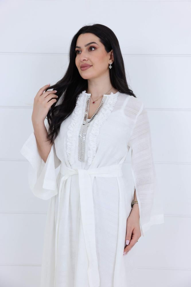 فستان ابيض جكار خفيف مزين بكشكش على الصدر وشك فضي لامع مع حزام للخصر