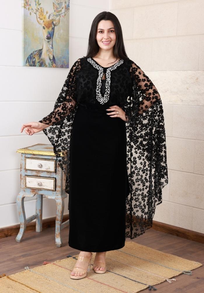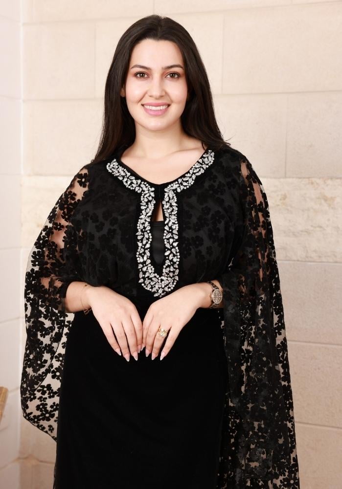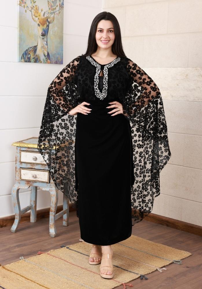 تألقي بأناقة لا تضاهى مع هذا الفستان الشتوي المخمل الفاخر باللون الأسود، مزود بتطريز كريستال لامع على الصدر وياقة مزخرفة بالدانتيل لتضفي لمسة من الفخامة.
