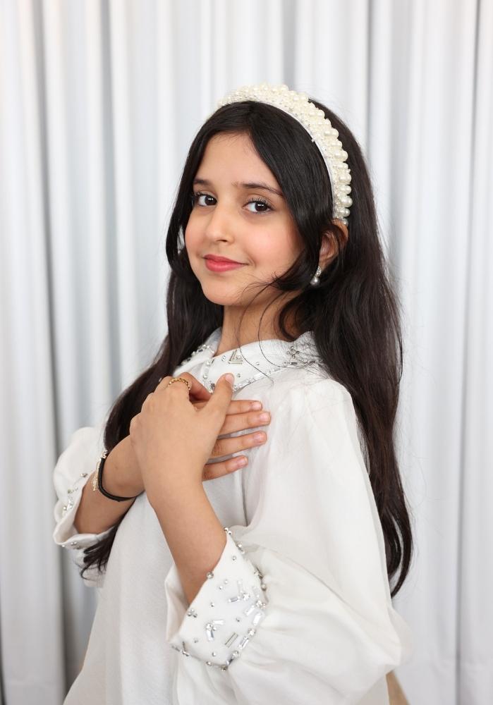 فستان بناتي اوجنزا تفته بياقه وكم مزينه بشك لامع لون سكري
