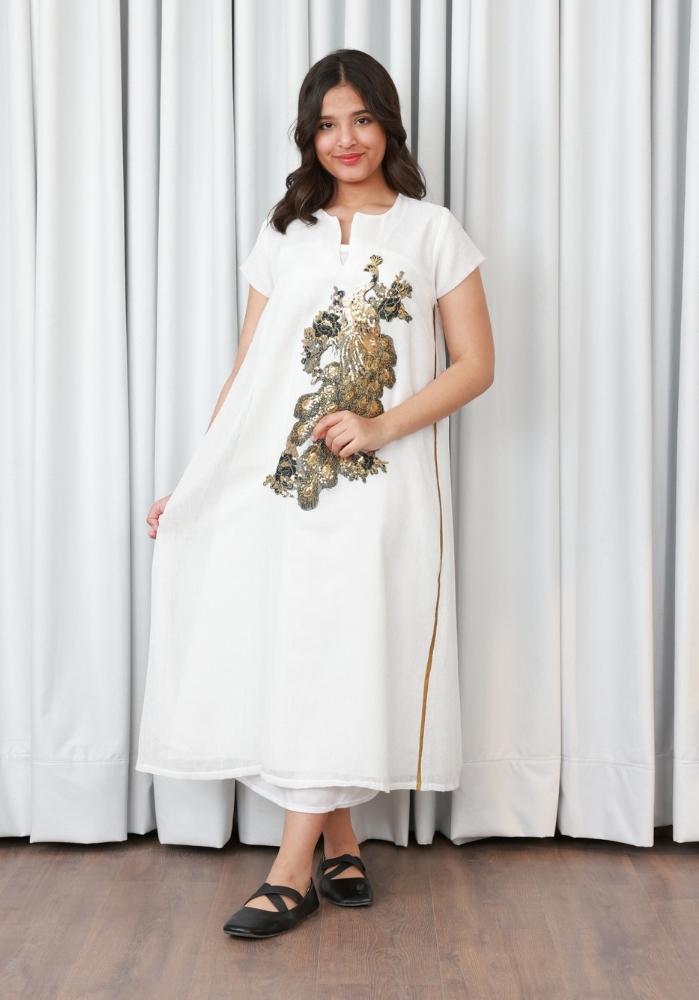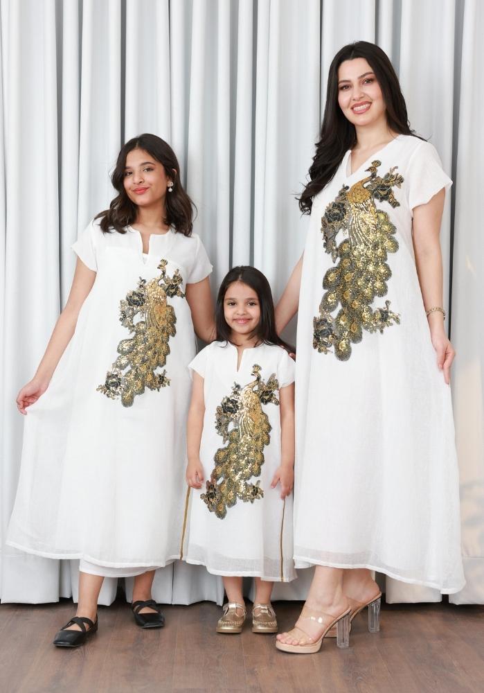 امنحي أميرتك الصغيرة إطلالة فاخرة مع هذا الفستان الراقي المصنوع من اللينن الناعم بلون سكري أنيق، والمزين بتفاصيل كلفة طاووس ذهبية تضفي عليه لمسة ملكية فريدة. يتميز الفستان بتصميمه الأنيق والمريح، مما يجعله الخيار المثالي للمناسبات الخاصة والاحتفالات العائلية.