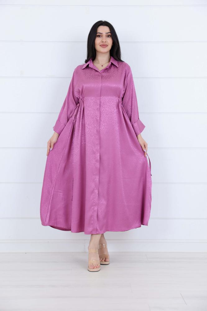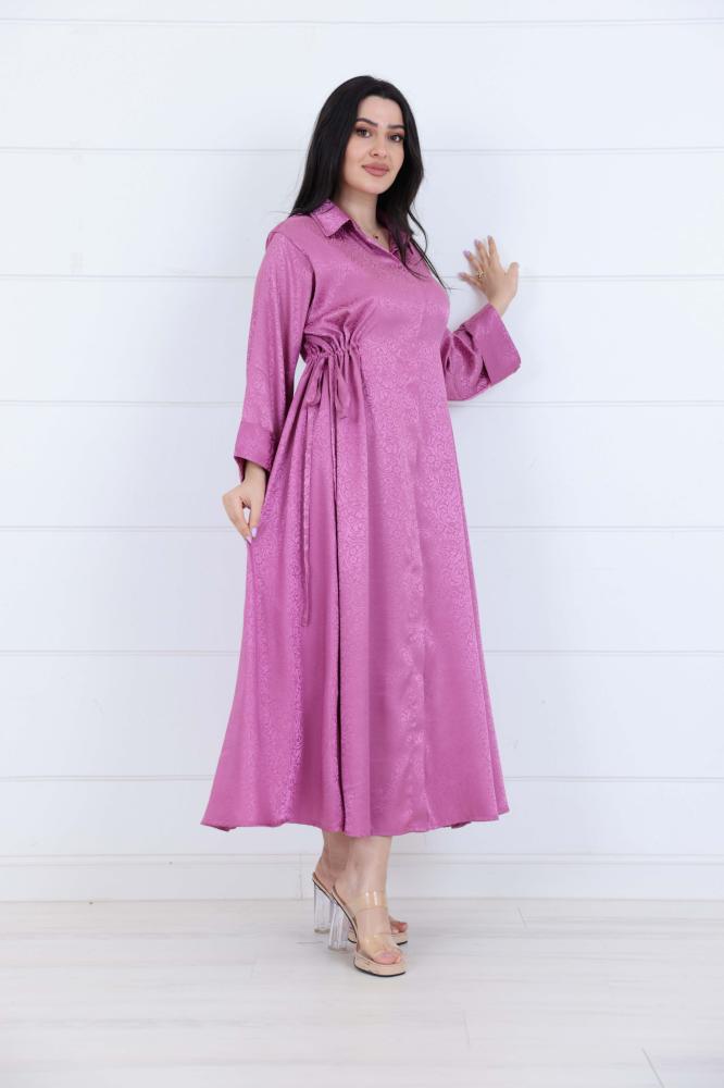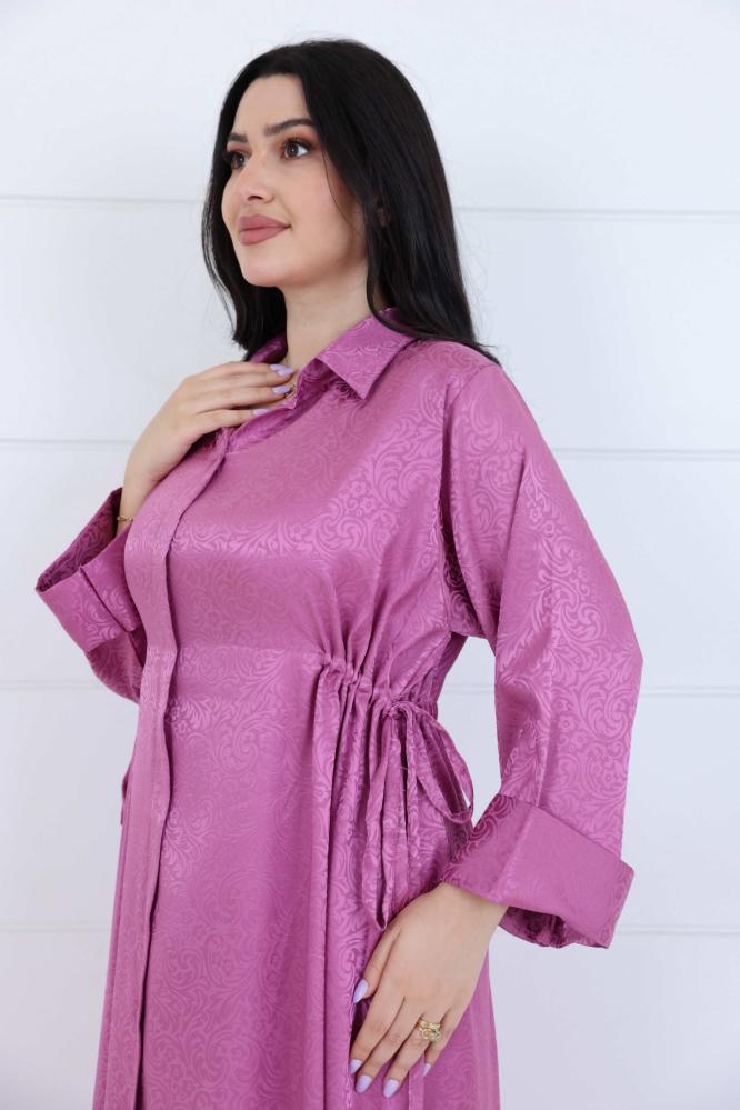 فستان جاكار برسمة زخارف عصرية مزين بربطات على الخصر وياقة كلاسيك لون موف