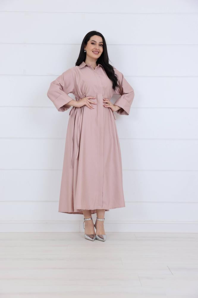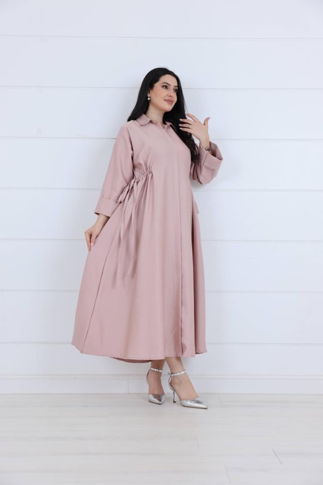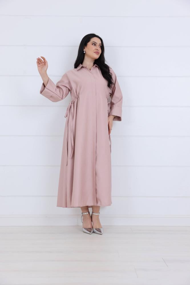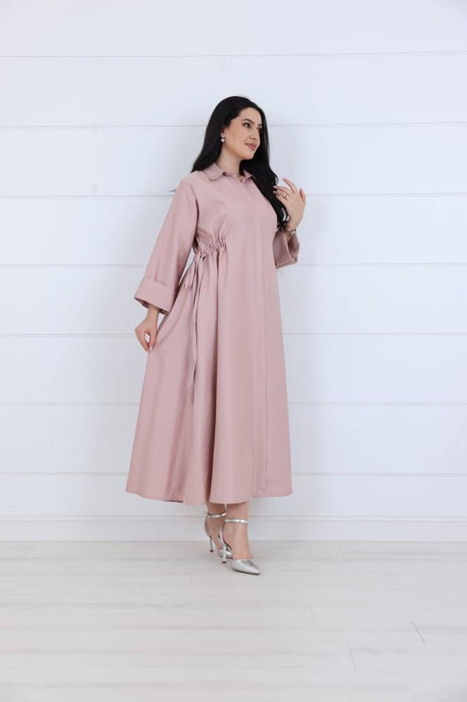 فستان جورسيه سادة خربزي ياقة كلاسك مزين بزم ربط على الخصر
