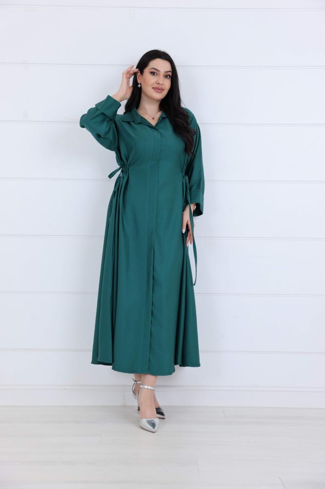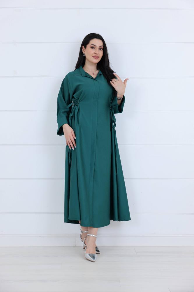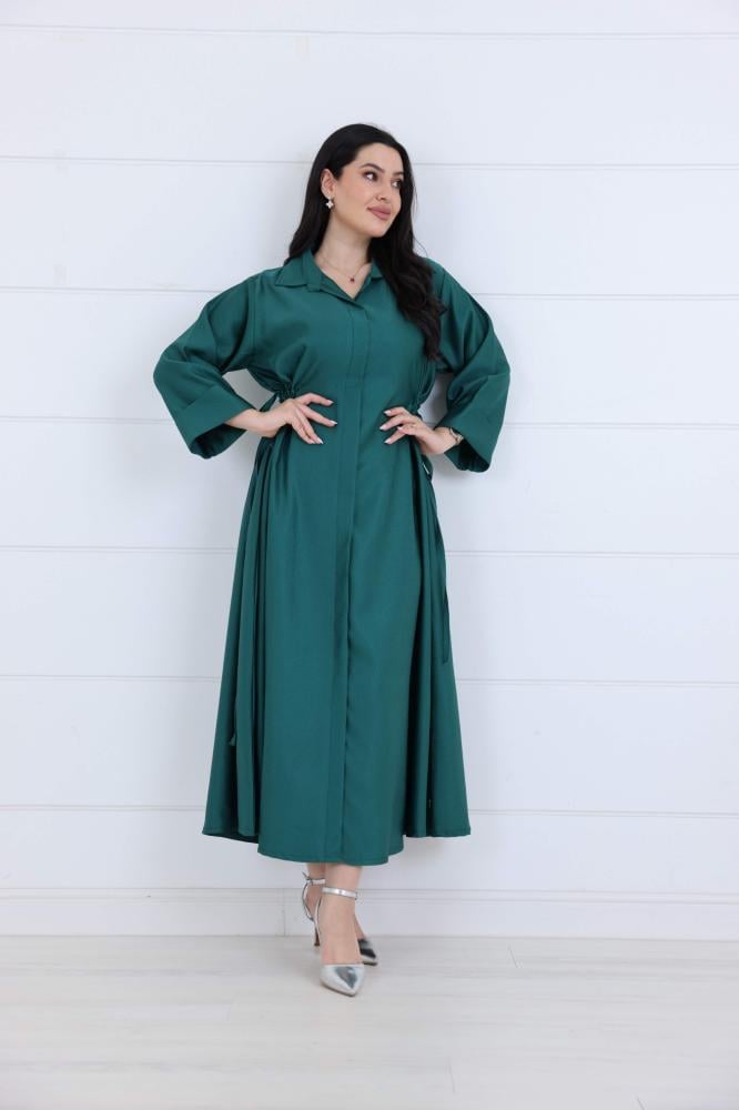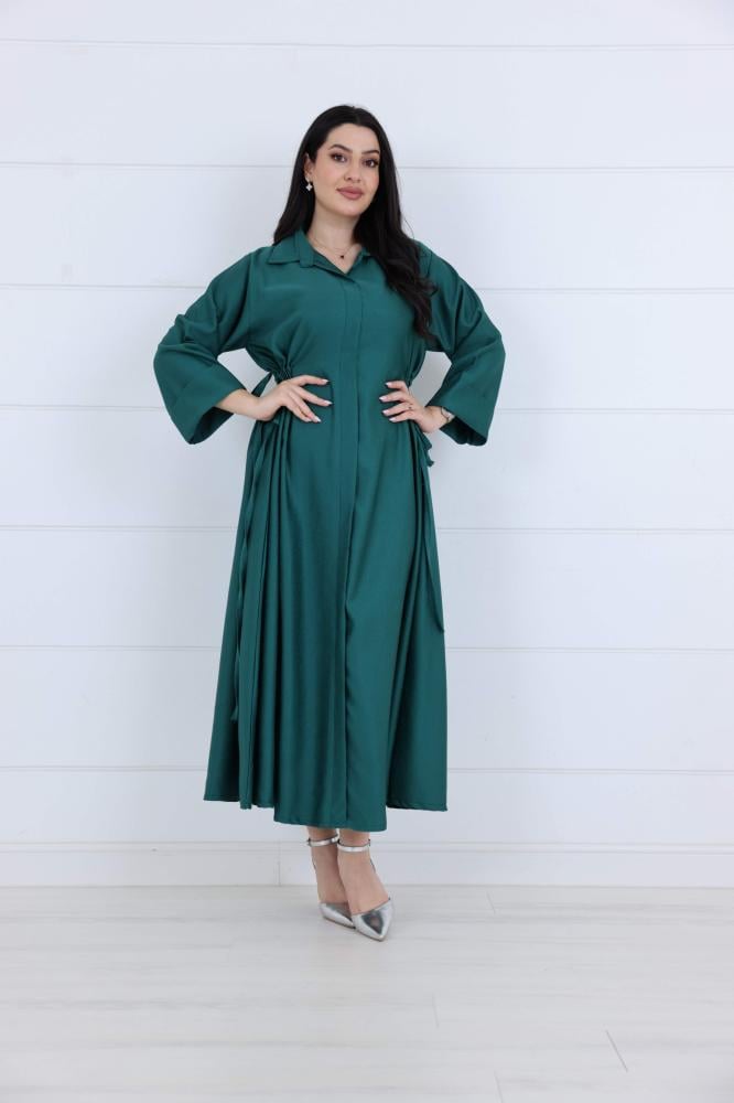 فستان جورسيه سادة ياقة كلاسك مزين بزم ربط على الخصر لون اخضر
