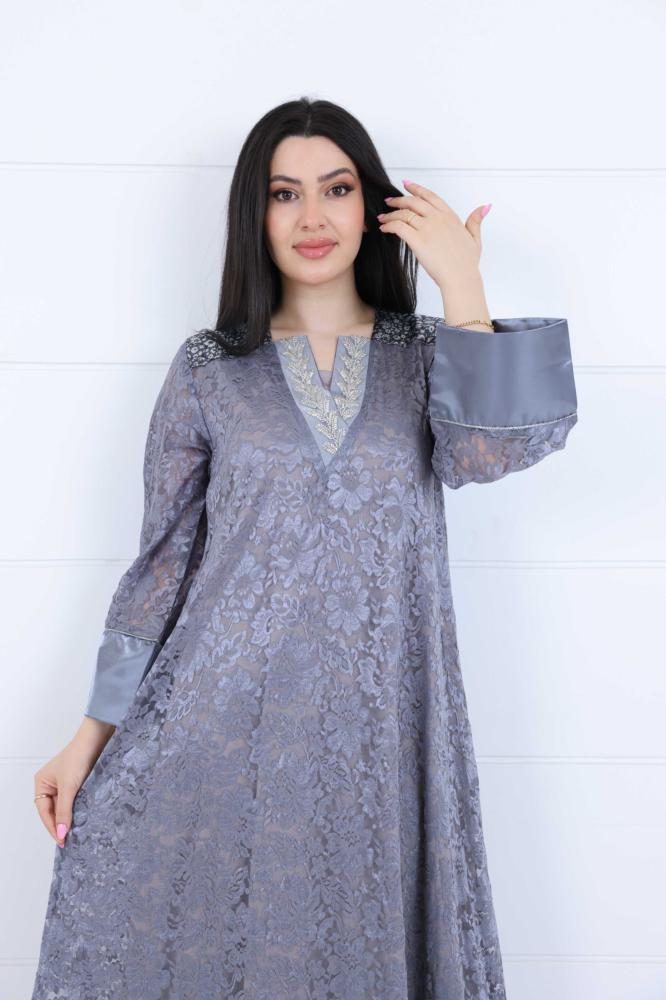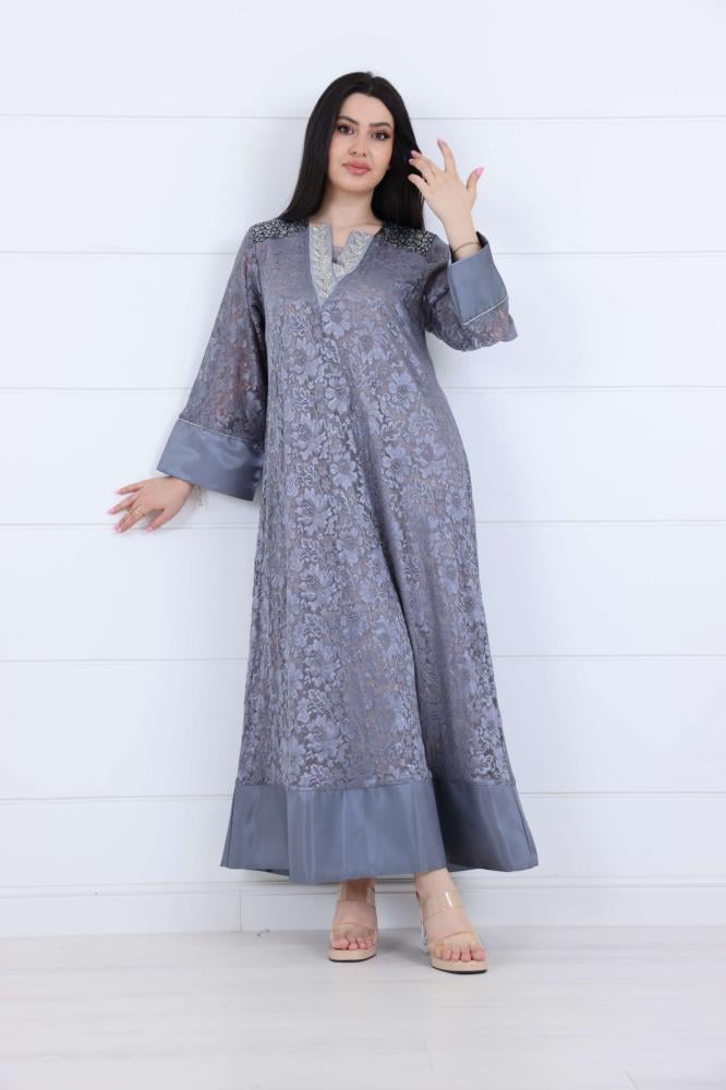 فستان دانتيل فاخر باللون الرمادي مع تطريز أنيق على الصدر وحواف بألوان مميزة، يوفر لك إطلالة ساحرة وأنيقة. الأكمام الطويلة والفستان ذو الطول الكامل يجعل منه الخيار المثالي للمناسبات الرسمية. التصميم البسيط والمميز مع التفاصيل اللامعة يعطي لمسة فاخرة.