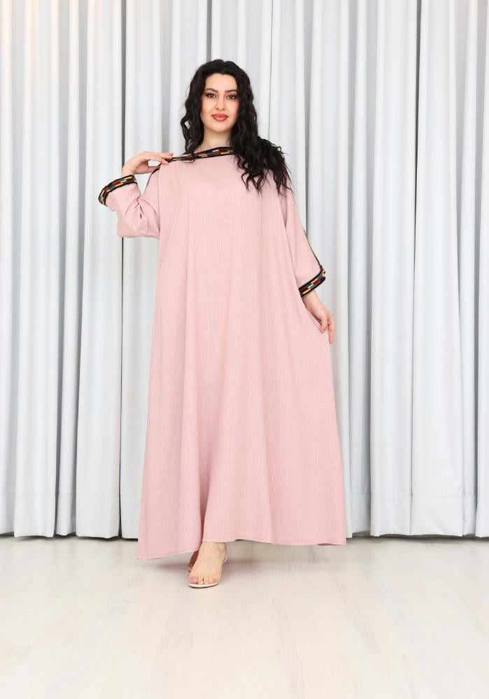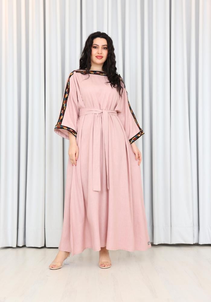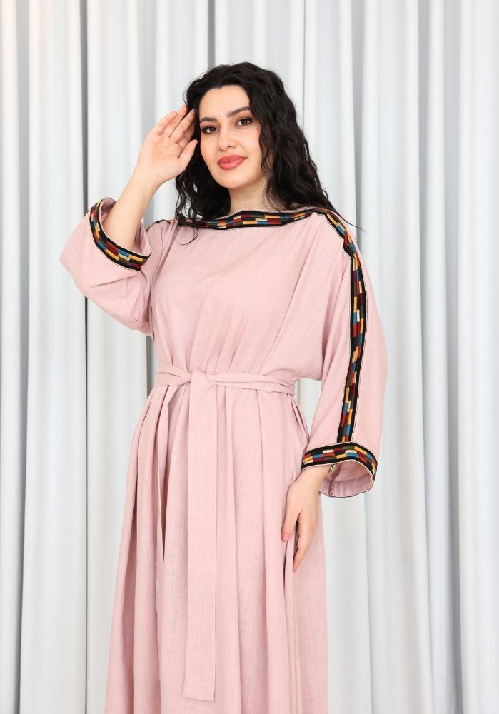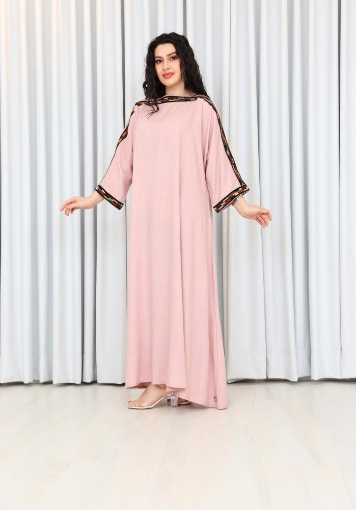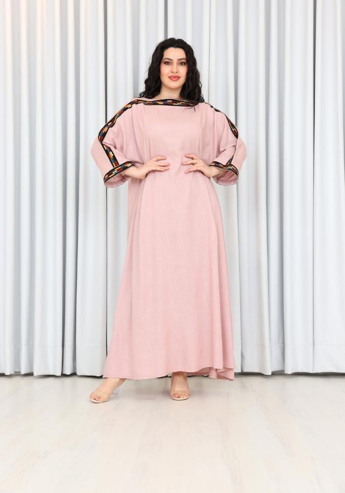 فستان سادة لينن مزين بتطريز على الاكتاف والاكمام