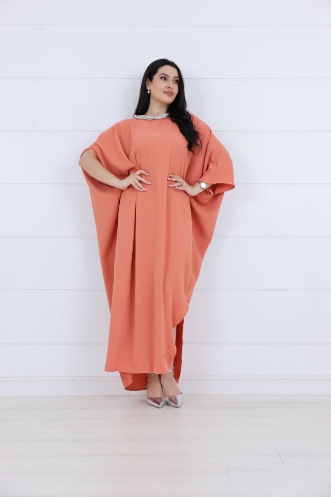 فستان سادة مزين بطوق الماس على الياقة وفصوص على كسرة الخصر لون اورنج