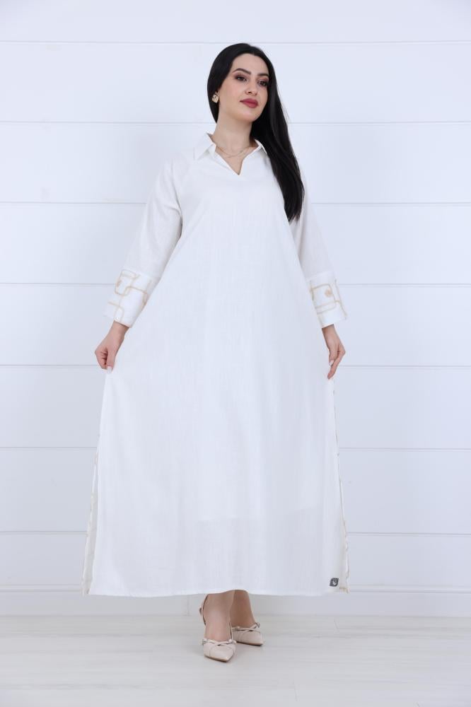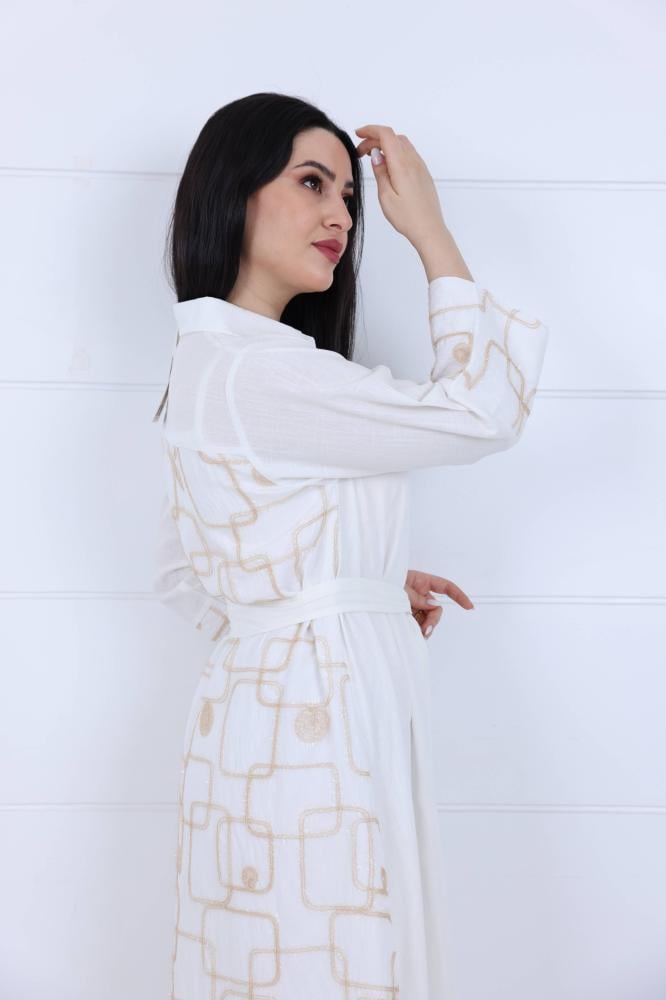 فستان نسائي صيفي لينن سكري مزين بتطريز ذهبي – ياقة قميص وتفاصيل راقية