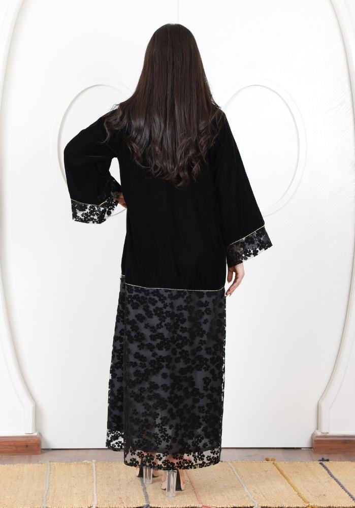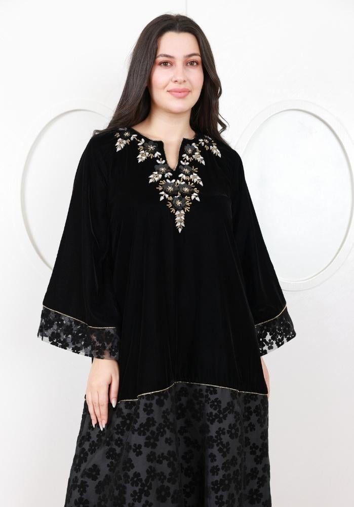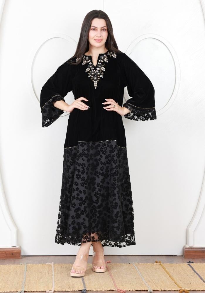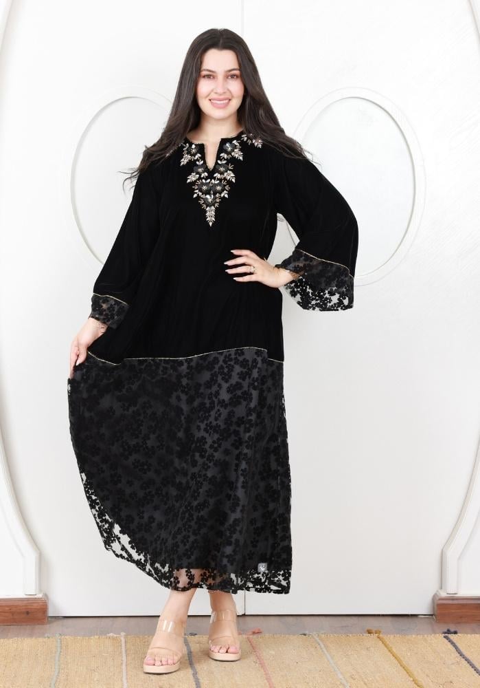 فستان شتوي فاخر من الفيلفيت الأسود مزين بتطريز كريستال لامع وزخارف ورود أنيقة على الصدر والياقة، ليضفي عليك إطلالة مفعمة بالرقي والأناقة.