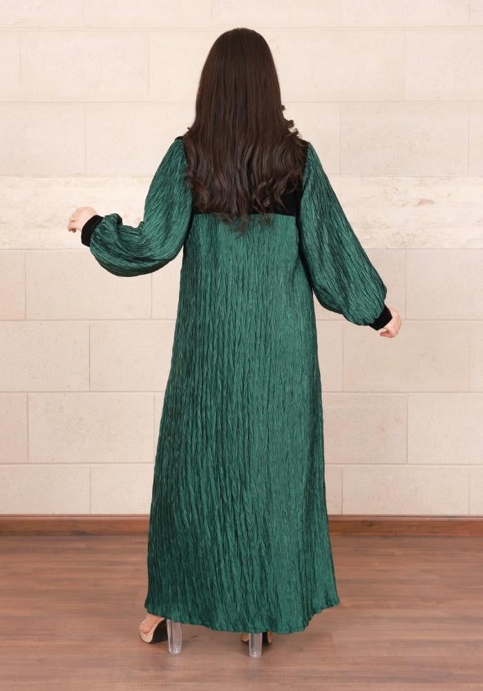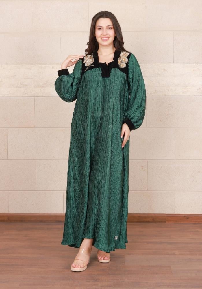 • لون أخضر مميز: يضيف اللون الأخضر الداكن لمسة من الفخامة، ويجعل الفستان مثاليًا لأناقتك في المناسبات الشتوية.