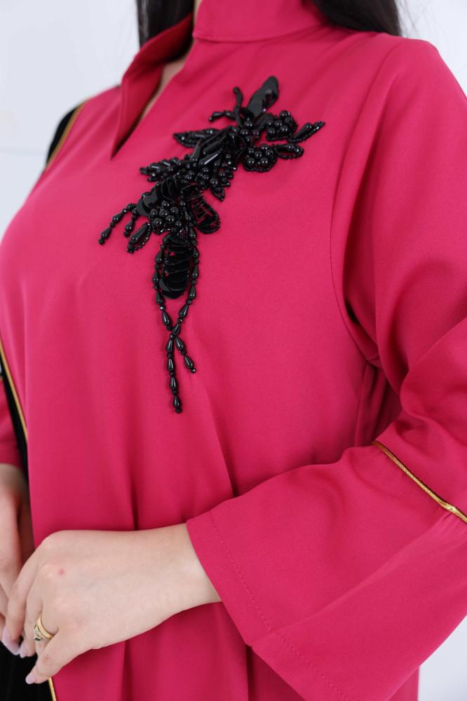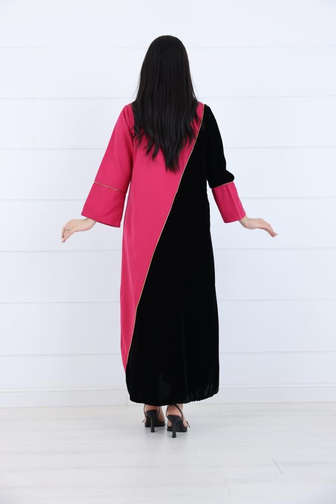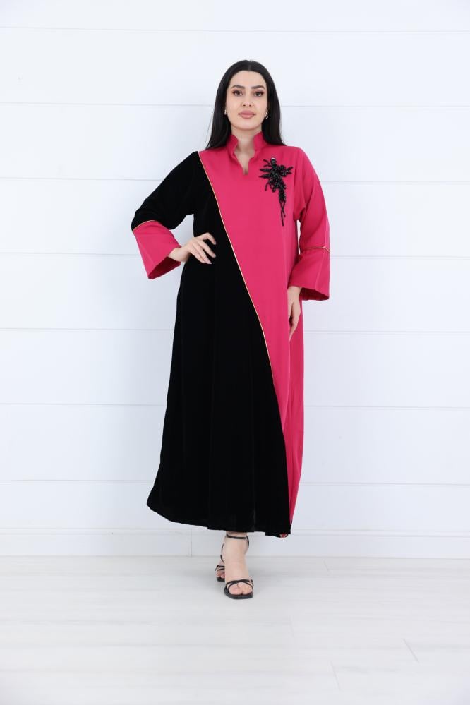 فستان شتوي مخمل مع كريب بتطريز اسود لون فوشي