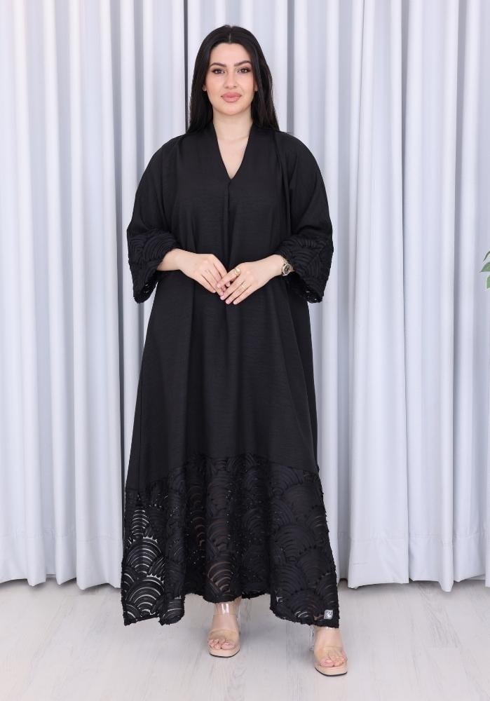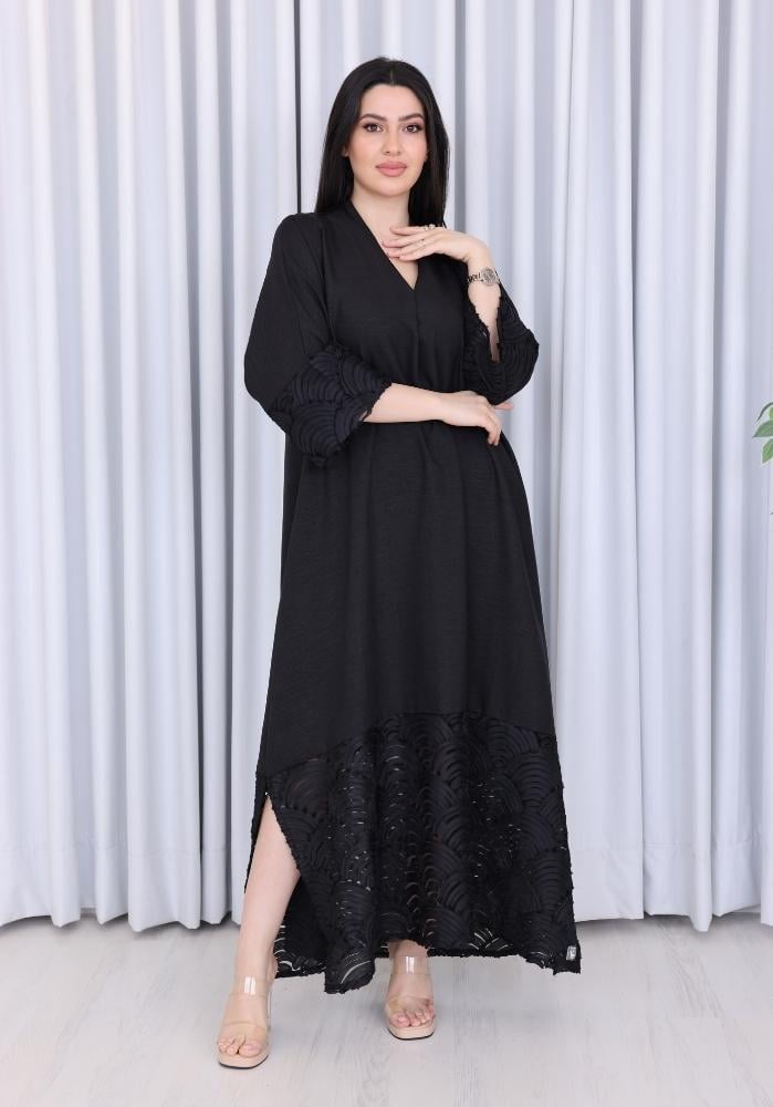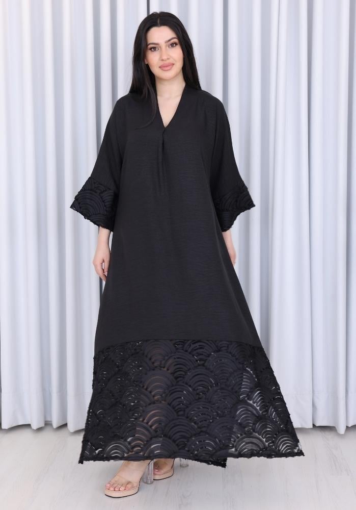 فستان قطن سادة قبة V مزين بخامة دانتيل من الاسفل والاكمام مع حزام للخصر