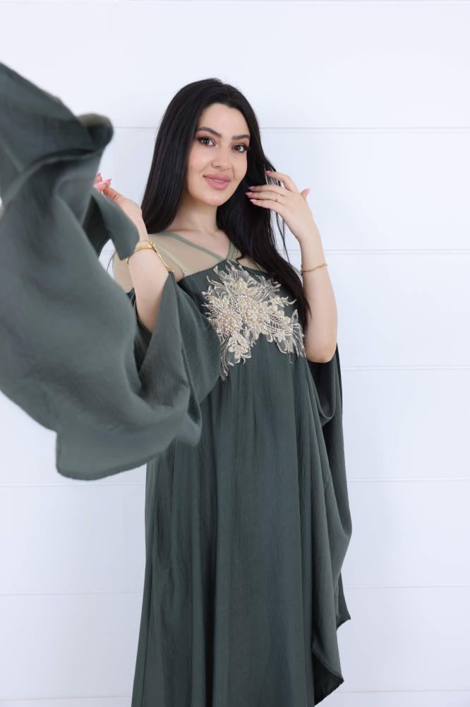 فستان لامية حرير بلمعة مطرز بالصدر لون زيتي