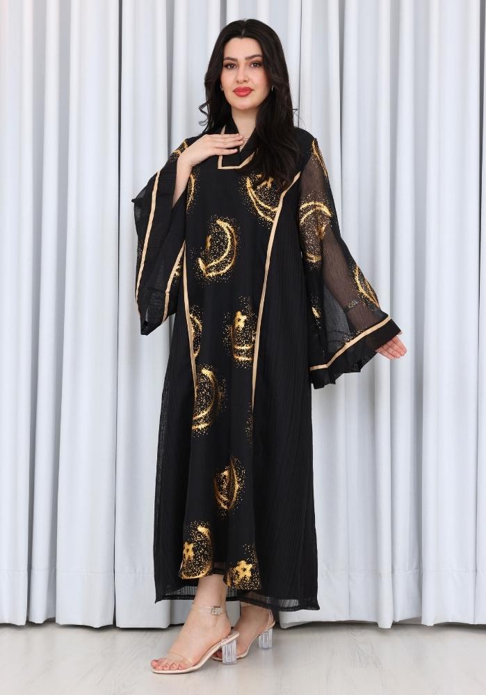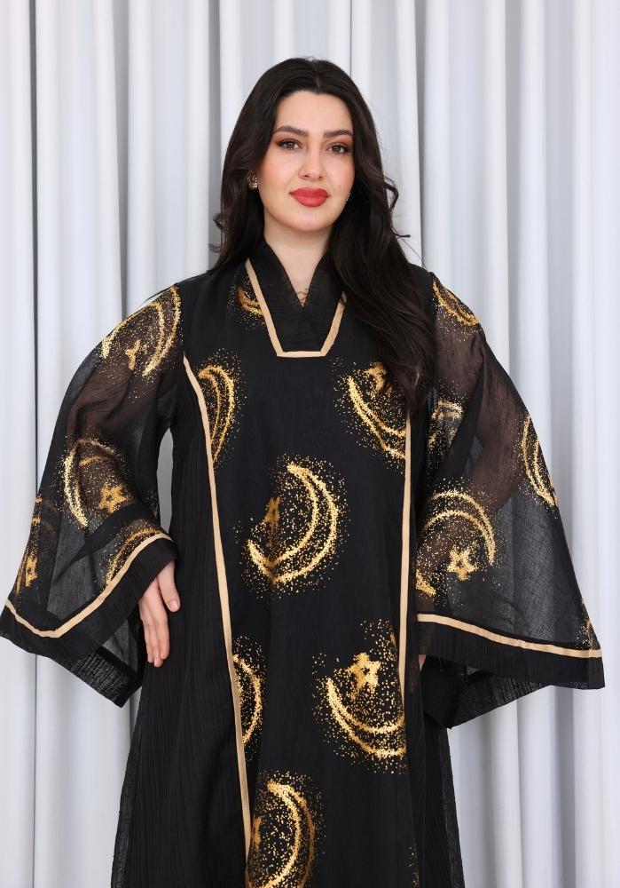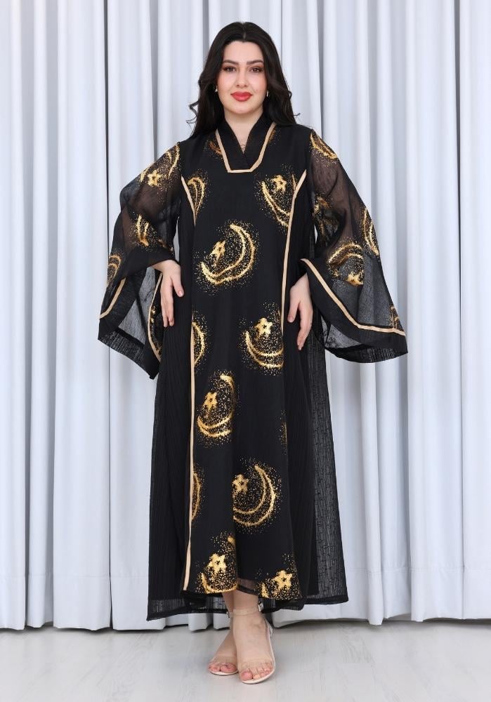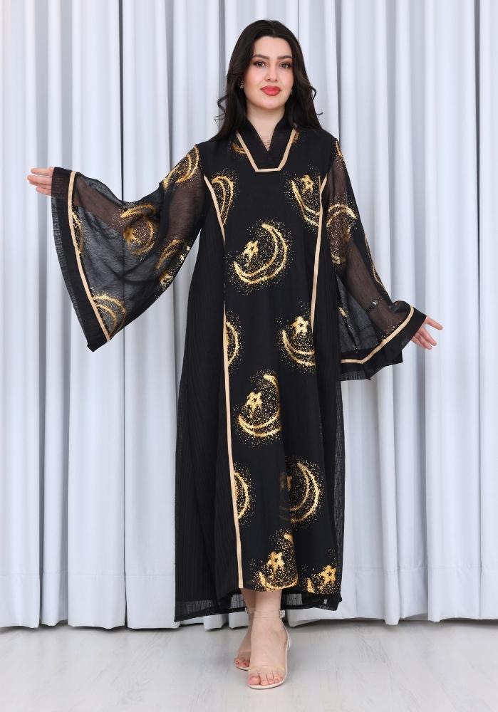 فستان لينن اسود مزين بطياعة هلال ذهبي على الصدر والاكمام مع ياقة V