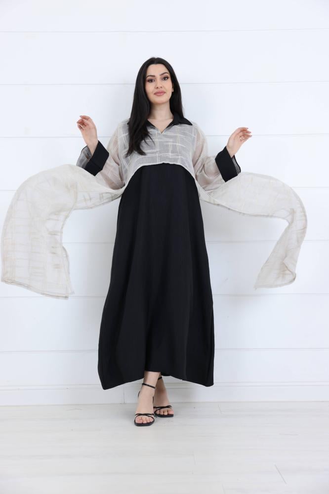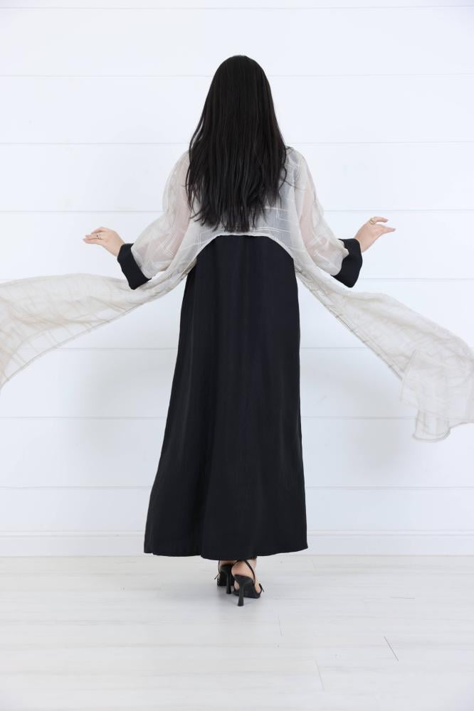 فستان لينن بتطريز ذهبي فضي لون بيج فاتح