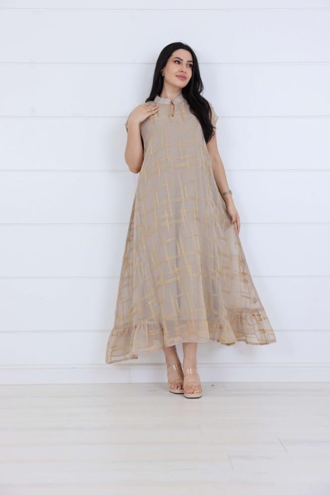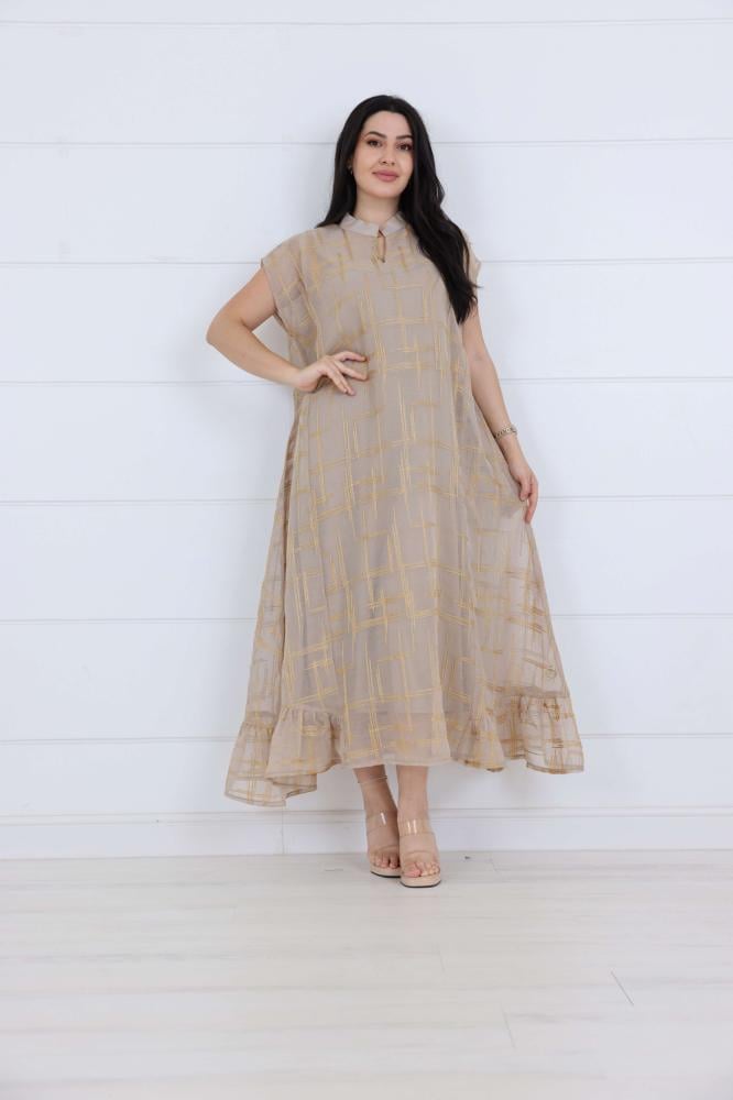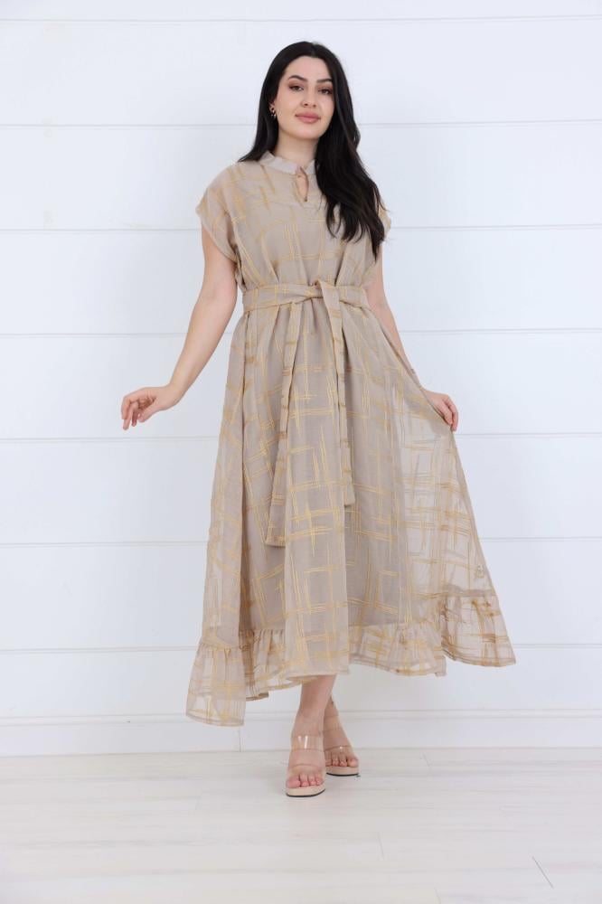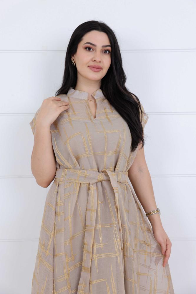 فستان لينن بيج غامق مزين بتطريز بيج مع حزام للخصر