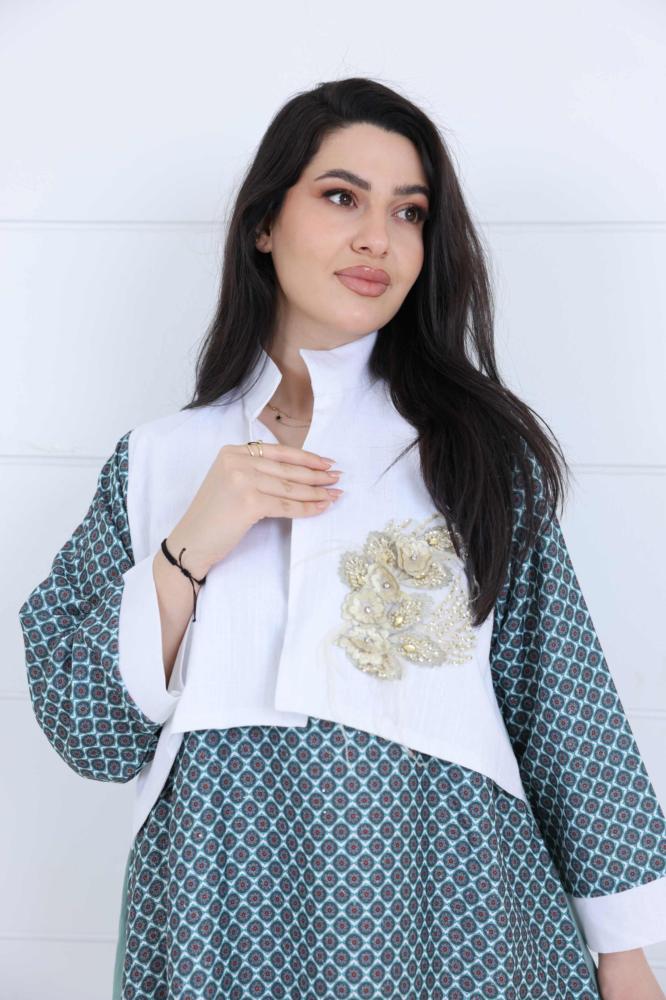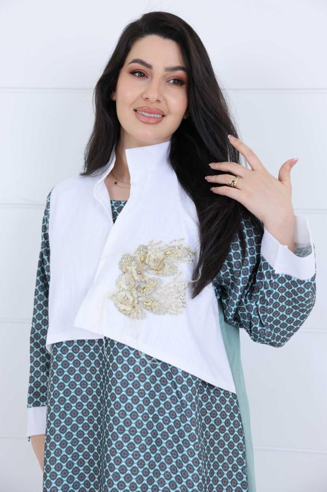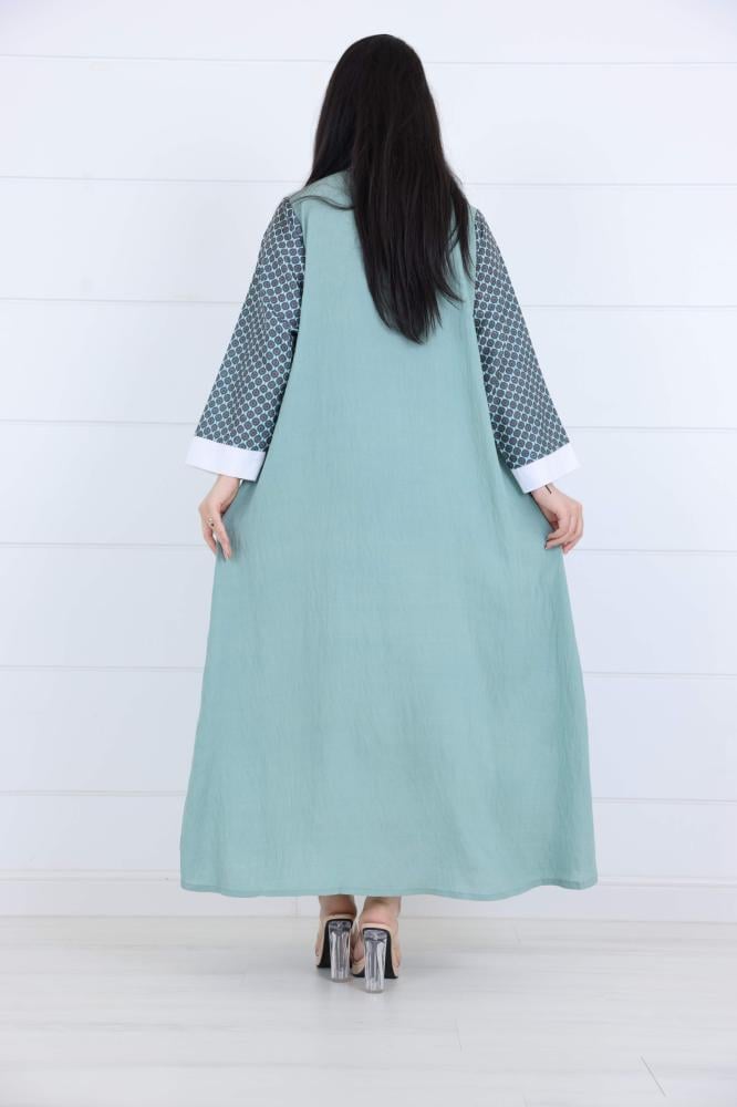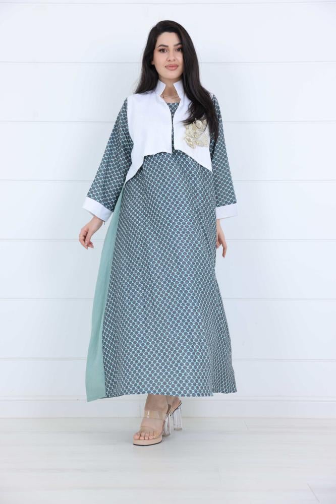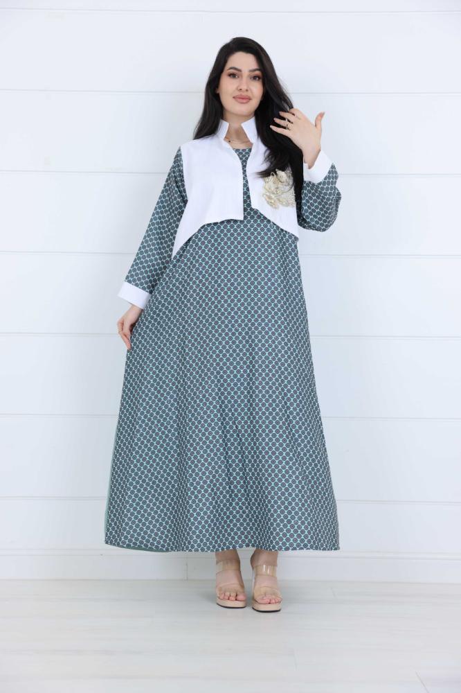 فستان نسائي لينن جاكار بتفاصيل أنيقة ونقشة هندسية – لون تيفاني ناعمتميّزي بإطلالة راقية في صيف السعودية مع هالفستان الفخم المصنوع من قماش اللينن الجاكار، بتصميم يعكس الذوق العصري والبساطة الراقية. اللون التيفاني يمنحك لمسة أنثوية منعشة، والتفاصيل البيضاء المطرزة على الصدر تضيف للفستان لمسة فنية ساحرة.