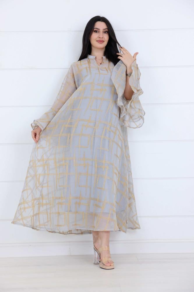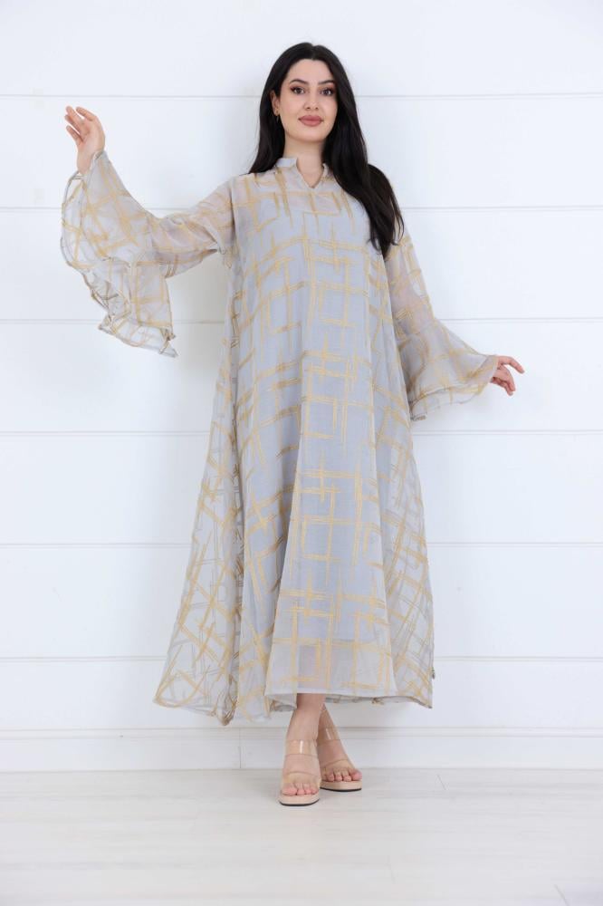 فستان لينن رمادي مزين بتطريز وبكم كلوش مع حزام للخصر