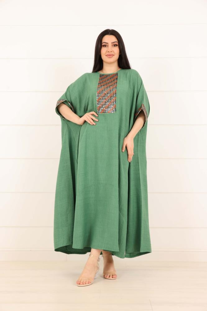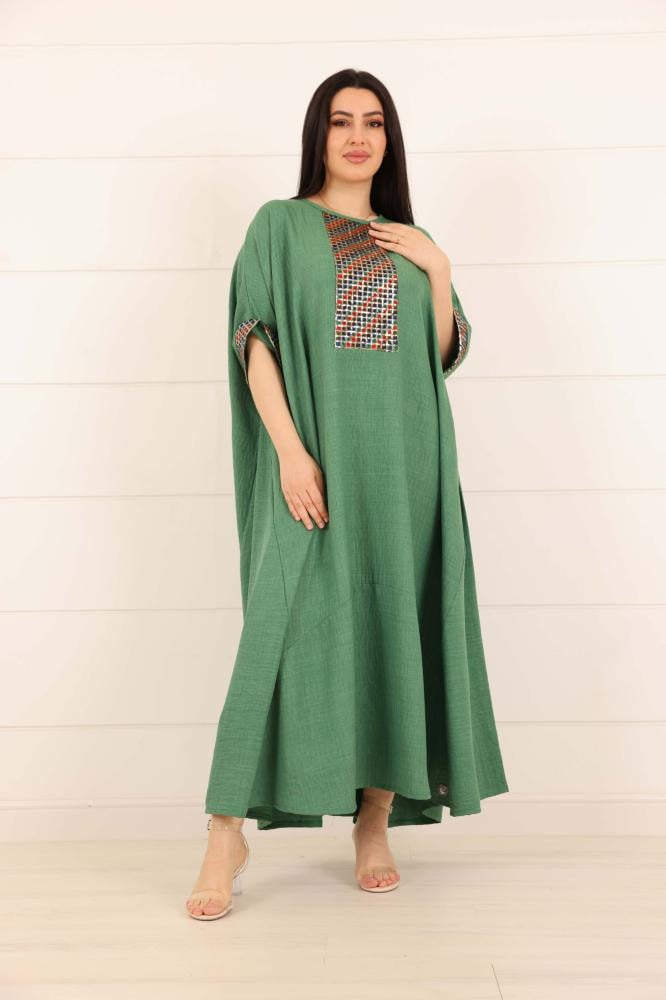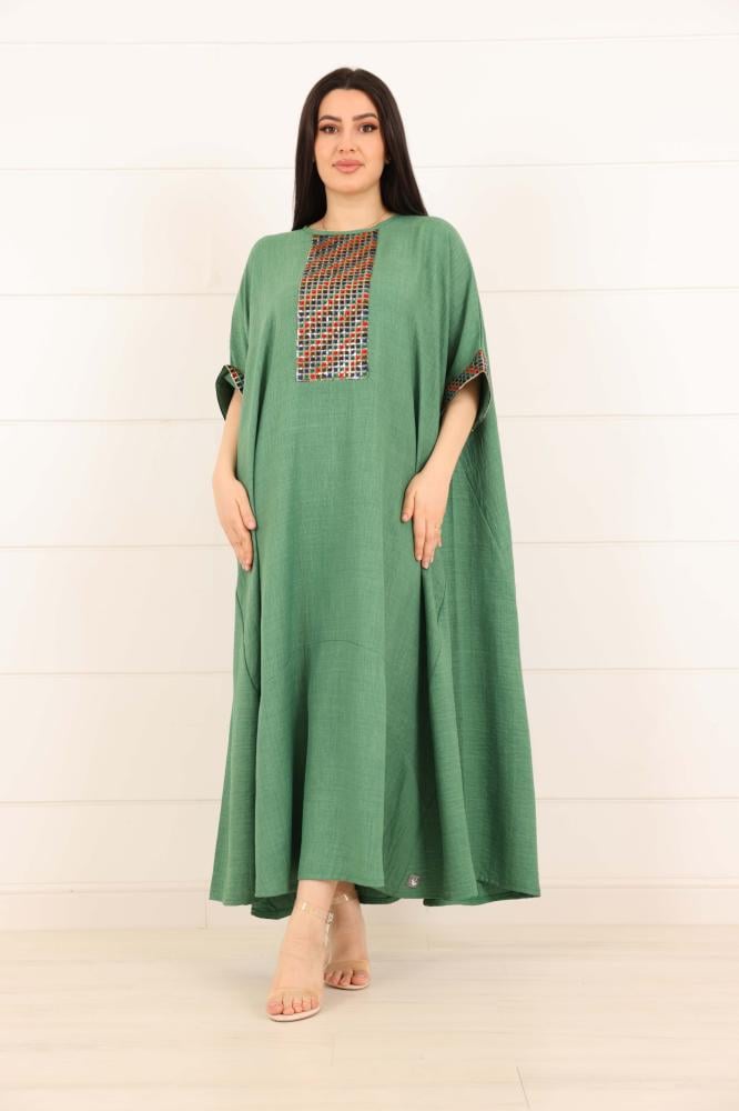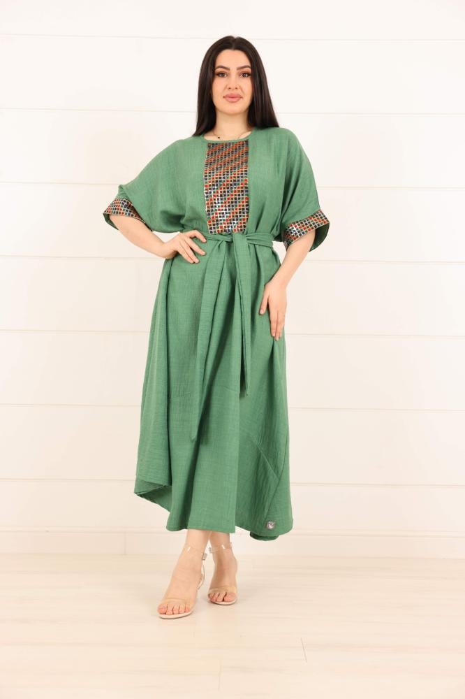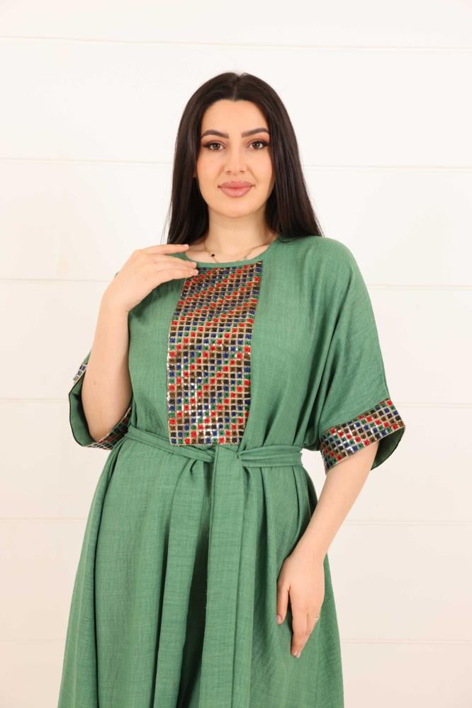 فستان لينن سادة مزين بخامة ترتر ملون على الصدر والاكمام لون اخضر