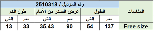 جدول المقاسات