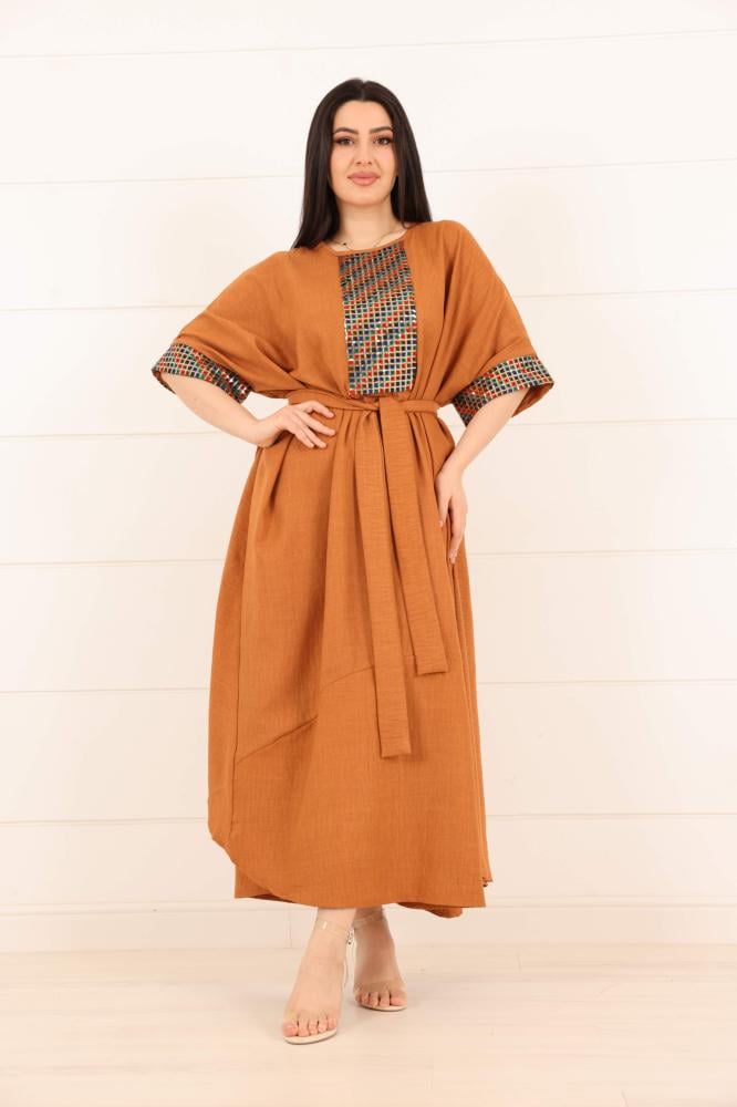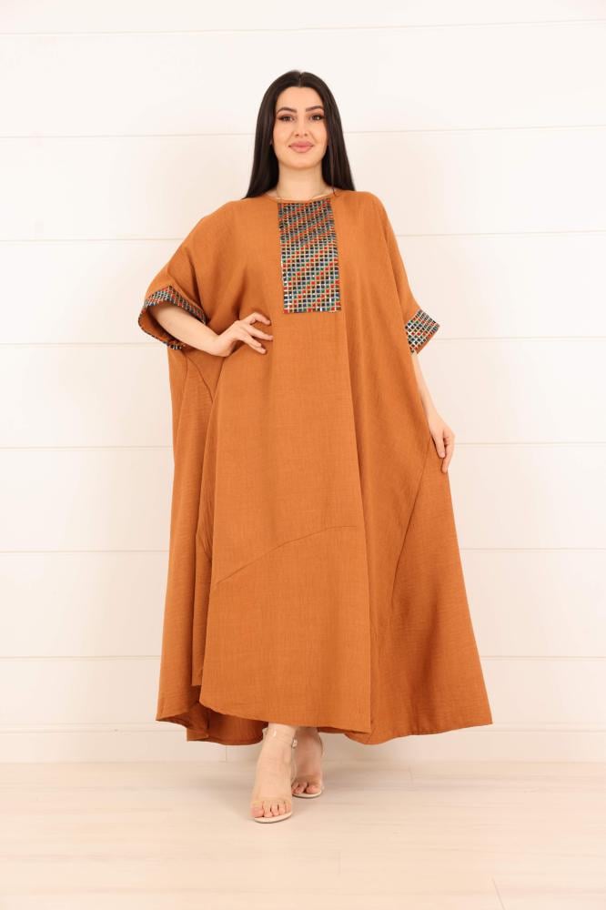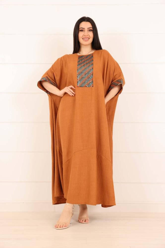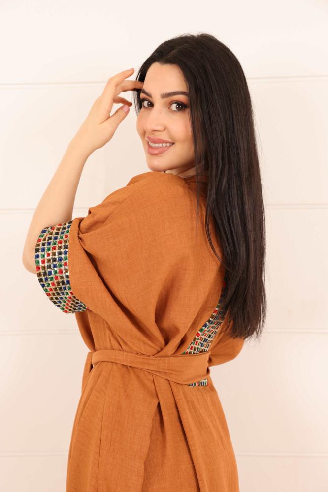 فستان لينن سادة مزين بخامة ترتر ملون على الصدر والاكمام لون اورنج