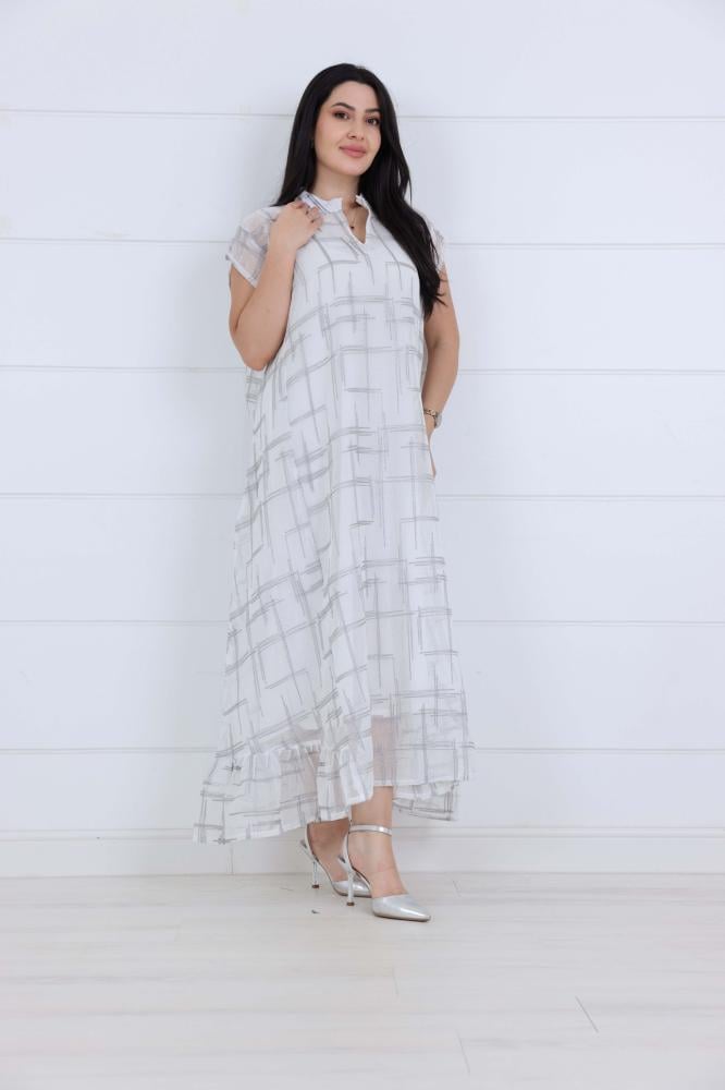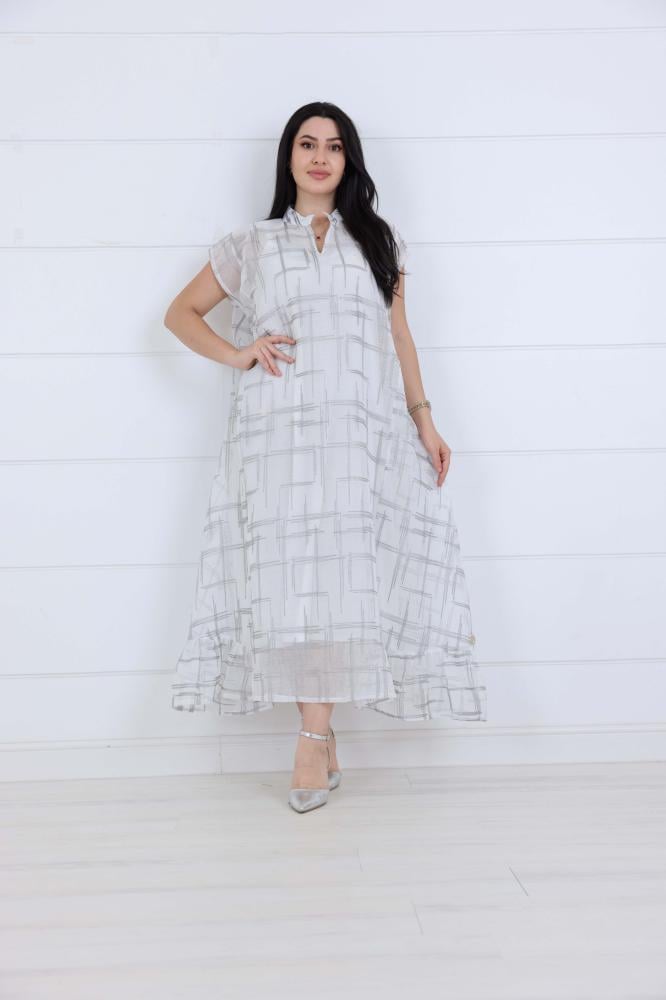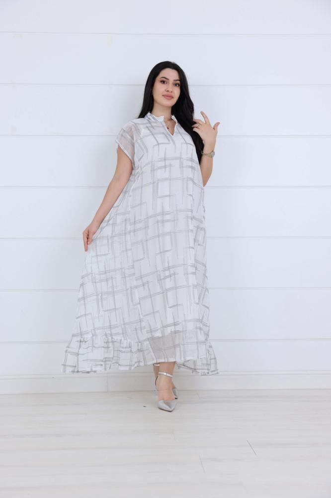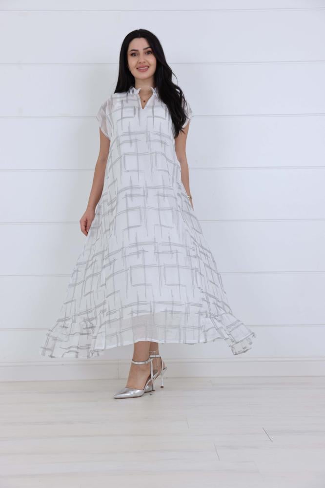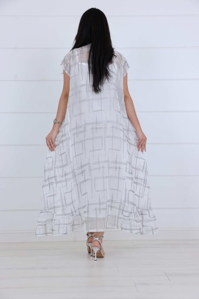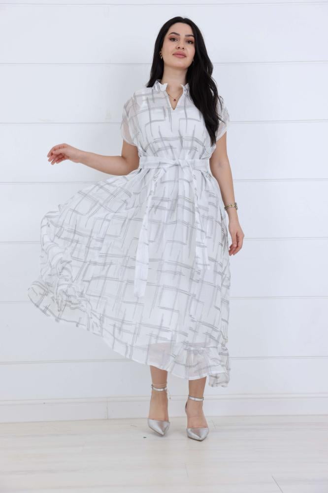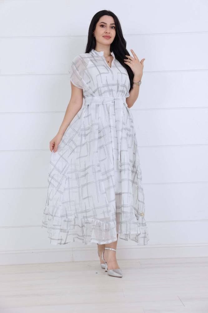 فستان لينن سكري مزين بتطريز رمادي مع حزام للخصر