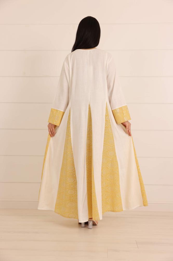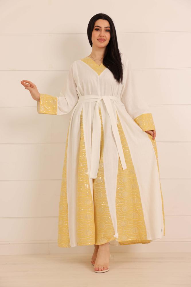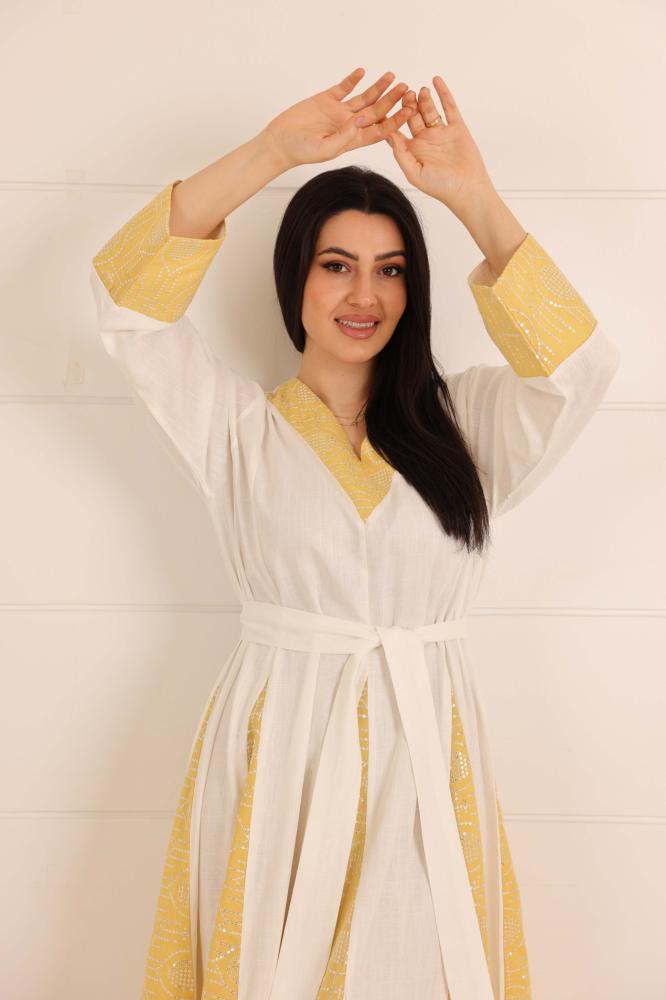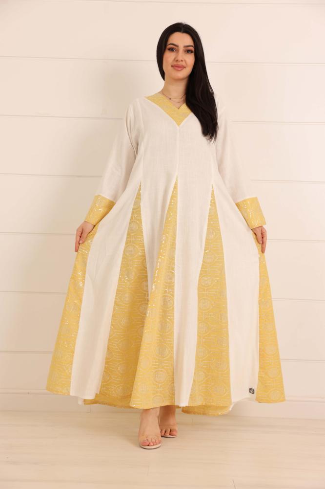فستان لينن كلوش مزين بقماش بتطريز فضي لامع  مع حزام  للخصر