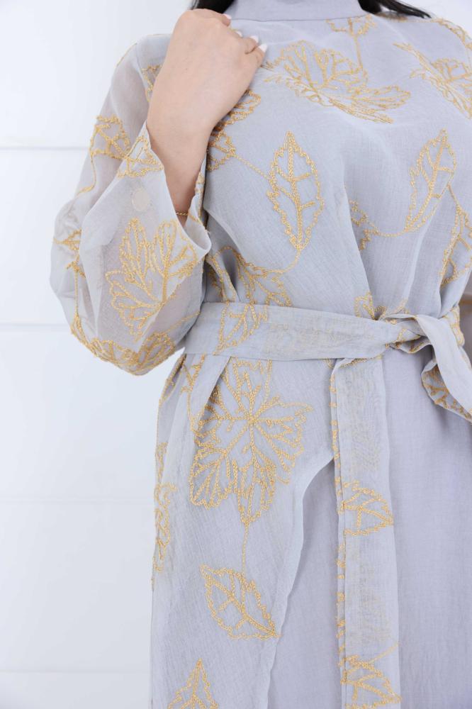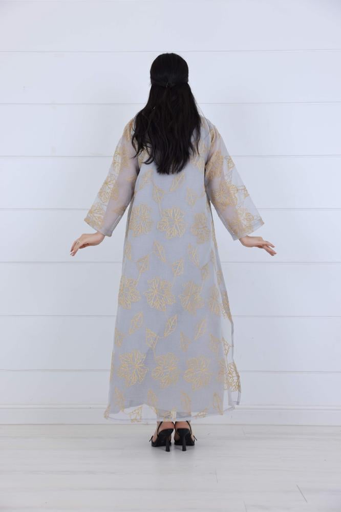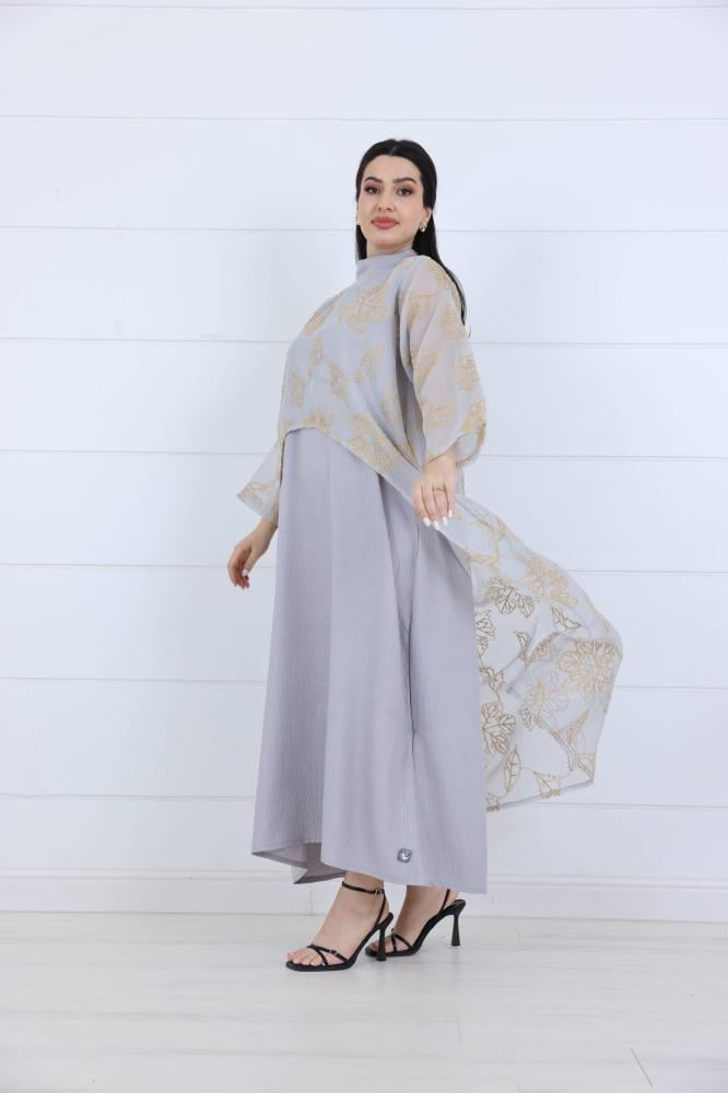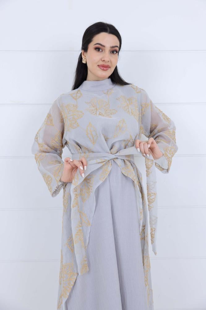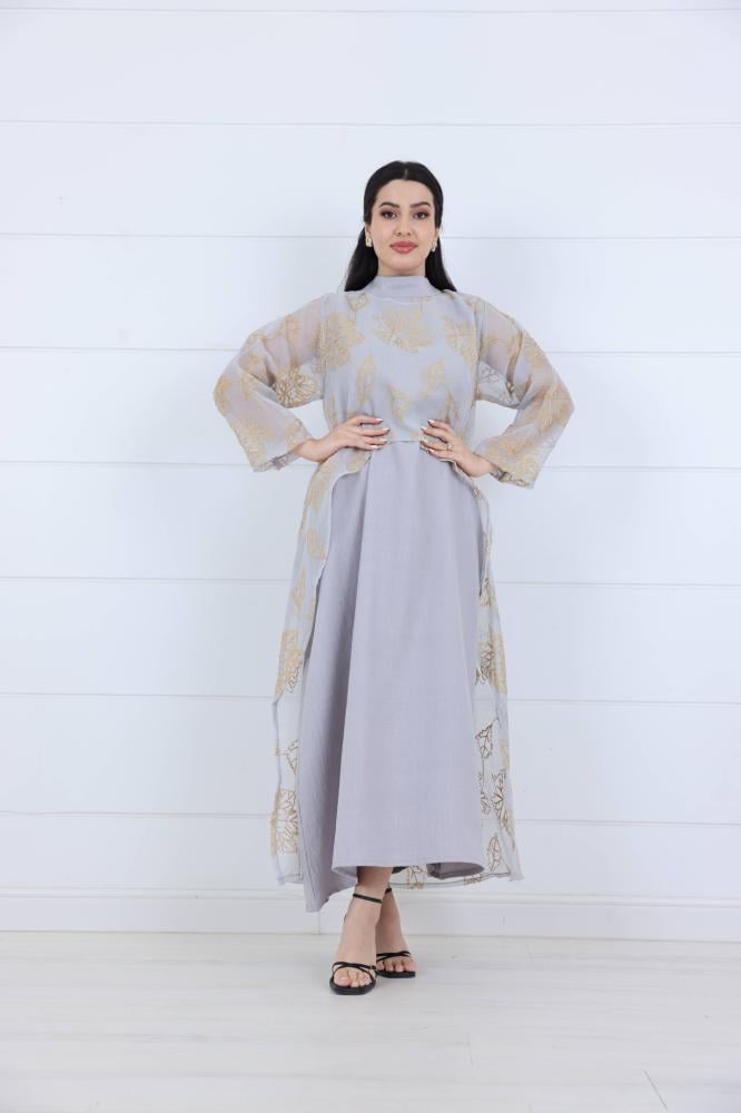 فستان لينن محاكة بخيوط موردة لون رمادي